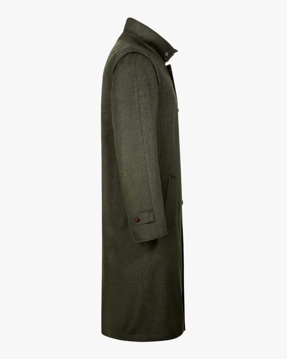 Innsbruck Hubertusmantel für Herren von Steinbock in Dunkelgrün. Dastraditionelle Modell überzeugt dank hochwertiger Schurwoll-Qualität und feinenVeloursleder-Paspeln. Klassische Elemente wie der Umlegekragen, geknöpfteÄrmelenden sowie ein dezenter Gehschlitz verleihen dem sonst rustikalen Designeine elegante Note.