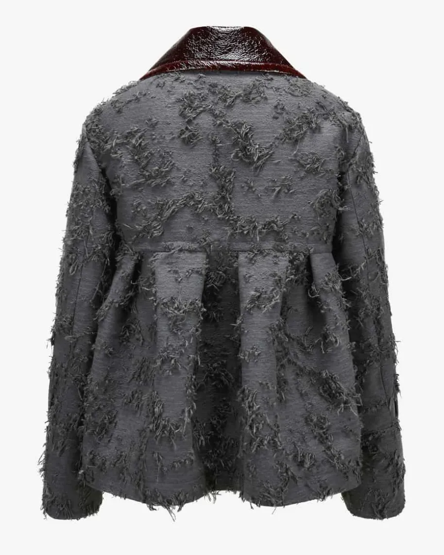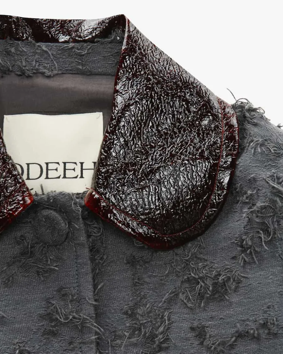 Jacke für Damen von Odeeh in Grau und Mahagoni. Das Modell in modischerJacquard- Aufmachung präsentiert sich dank markantem Bubikragen in Lackleder-Optik sowie Fransen- Details als moderner Dark Romance-Favorit, welcher dank demSchößchen einen femininen Twist mit Babydoll-Charakter erhält.