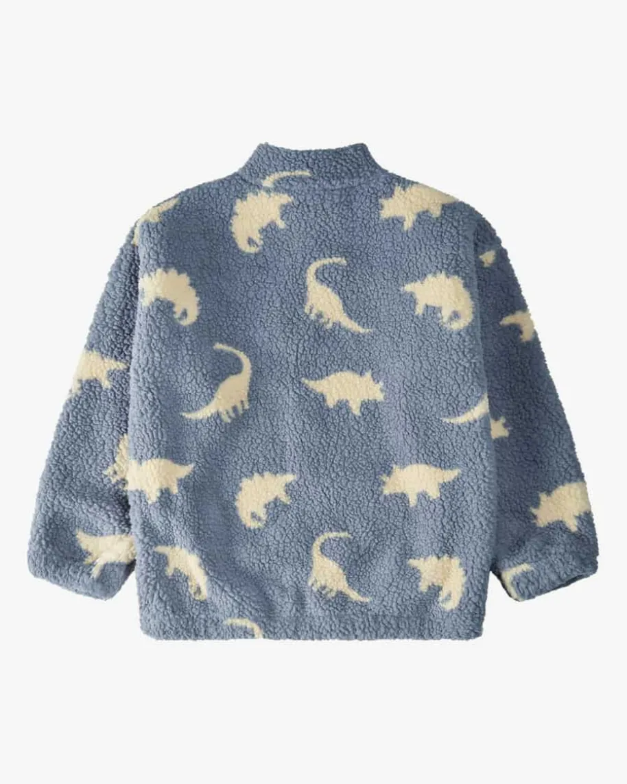 Jody Fleecejacke für Jungen von Konges Slojd in Blau und Off-White. Das Modellpunktet dank der weichen Fleece-Qualität mit einer angenehmen Haptik, währenddas Dinosaurier-Allover-Muster verspielte Akzente setzt.