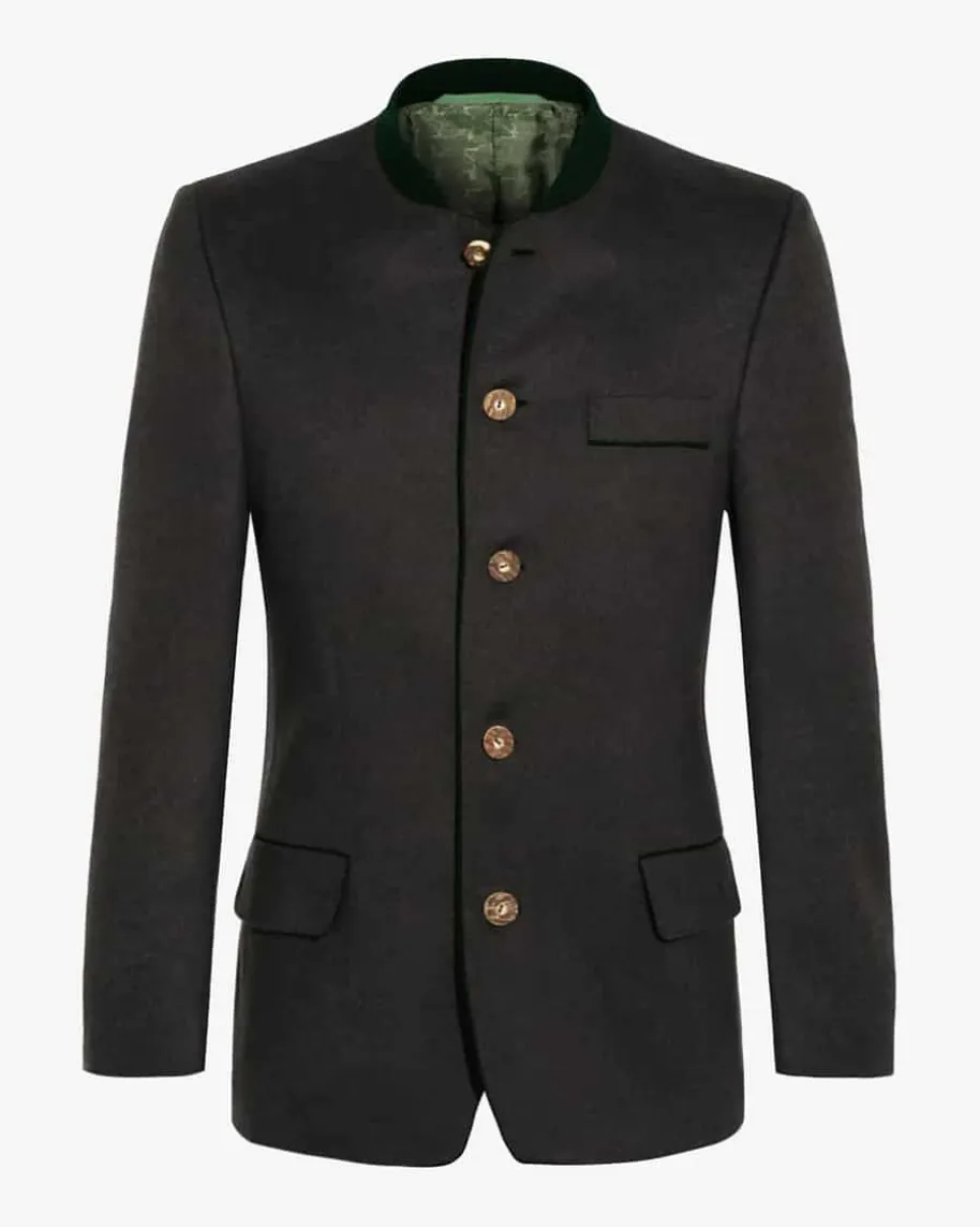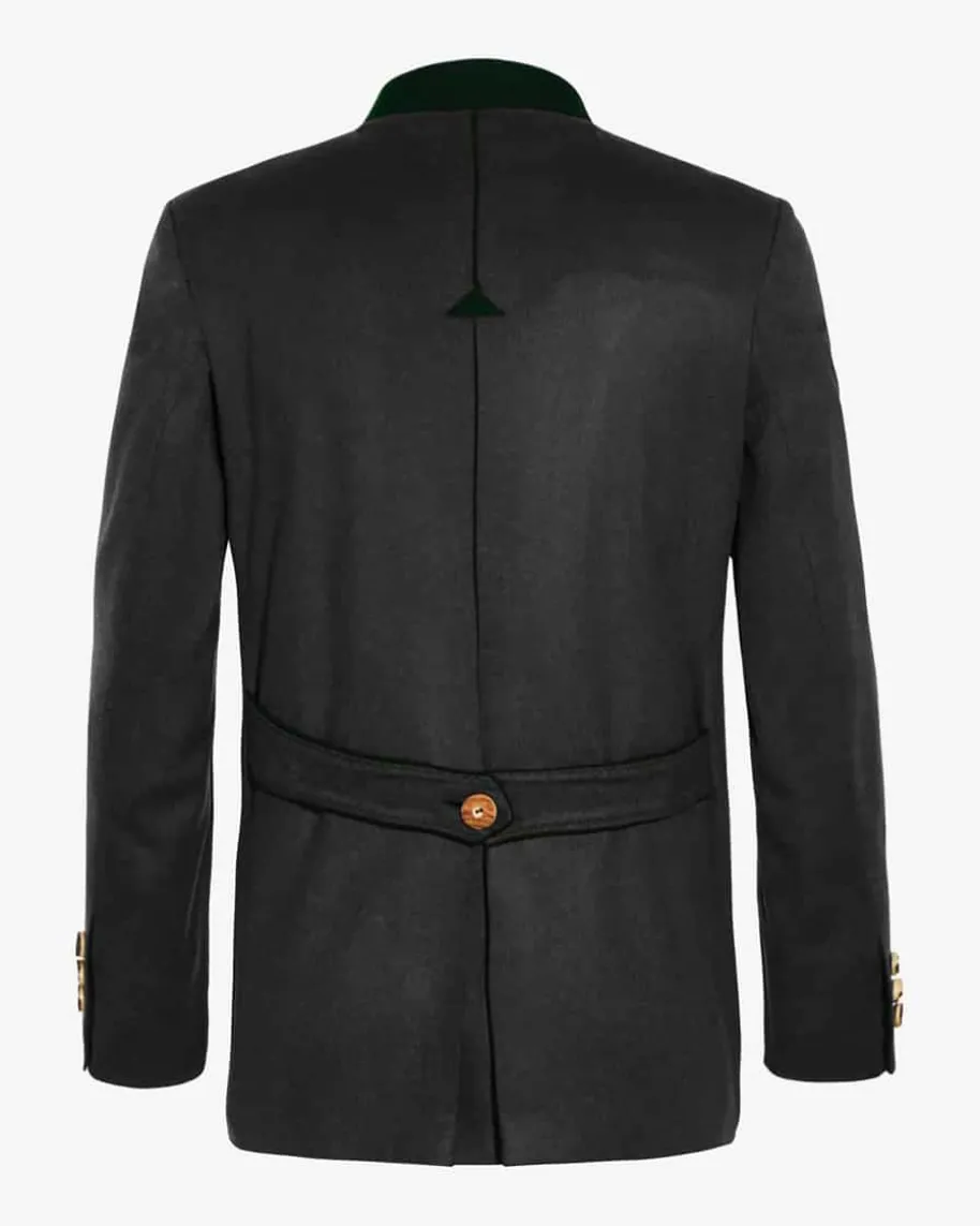 Johann Karl Trachten-Janker für Herren von Habsburg in Anthrazit. Das Modell mit Taillenabnähern weist dank der Verwendung von feinen Cashmere-Fasern eine weiche und zugleich edle Haptik auf. Klassische Hirschhornknöpfe sowie kontrastierende Paspelierungen am Stehkragen, an der Knopfleiste und den drei Außentaschen setzen traditionelle Akzente, während die Rückseite eine Kellerfalte sowie einen geknöpften Riegel aufweist.