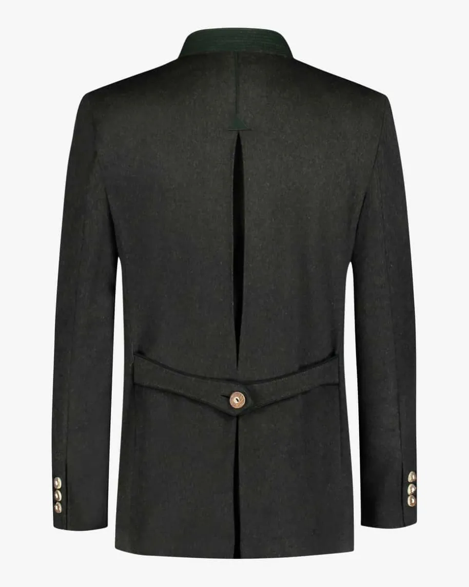 Johann Karl Trachten-Janker für Herren von Habsburg in Dunkelgrün. Das ModellmitTaillenabnähern weist dank der Verwendung von feinen Cashmere-Fasern eine weicheund zugleich edle Haptik auf. Klassische Hirschhornknöpfe sowie kontrastierendeElemente am Stehkragen und den drei Außentaschen setzen traditionelle Akzente,während die Rückseite eine Kellerfalte sowie einen geknöpften Riegel aufweist.