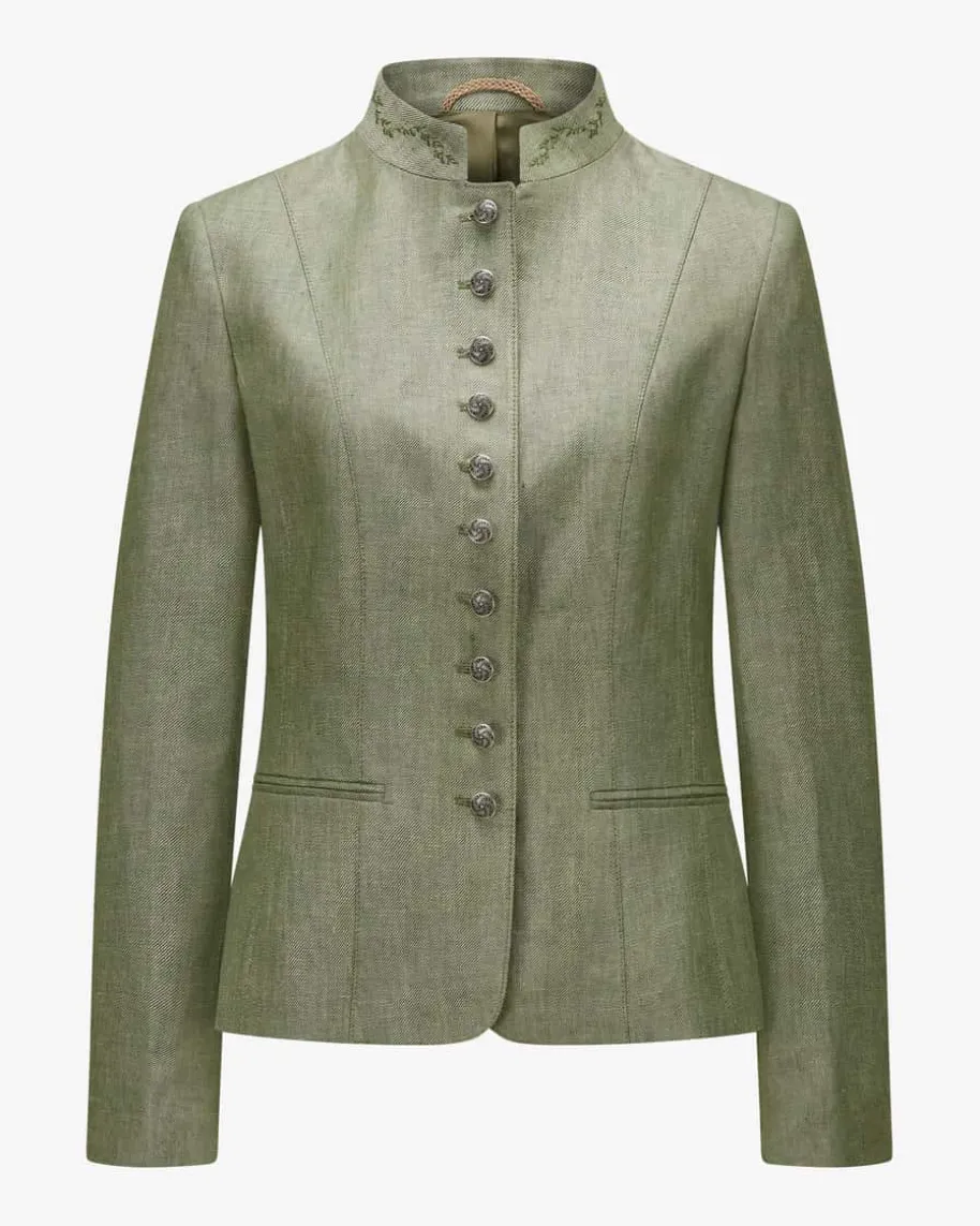 Juliette Trachtenblazer für Damen von Grasegger Manufaktur in Oliv. Dastaillierte Modell aus hochwertiger Leinen-Qualität präsentiert sich dank derstilvollen Knöpfe in traditionell-authentischer Aufmachung, während dierückseitige Kellerfalte sowie feine Stickereien auf dem Kragen den Trachten-Lookharmonisch vollenden.