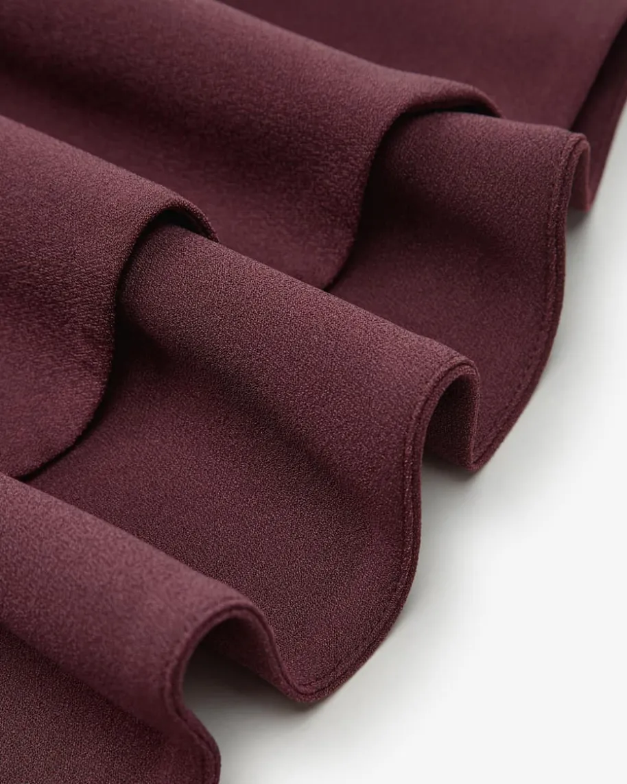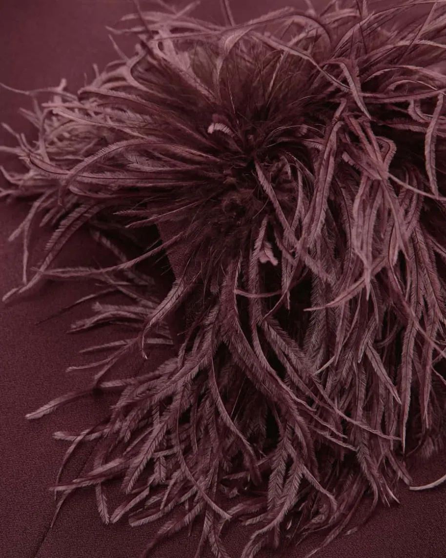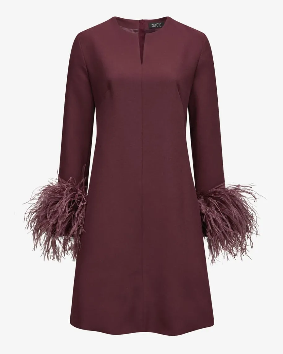 Karoline Kleid für Damen von SLY010 in Bordeaux. Das Modell präsentiert sich mitextravagantem Ärmel-Besatz mit tonigen Federn, während die feminine Silhouettein A-Form mit geschlitztem Ausschnitt einen eleganten Abend-Look kreiert.
