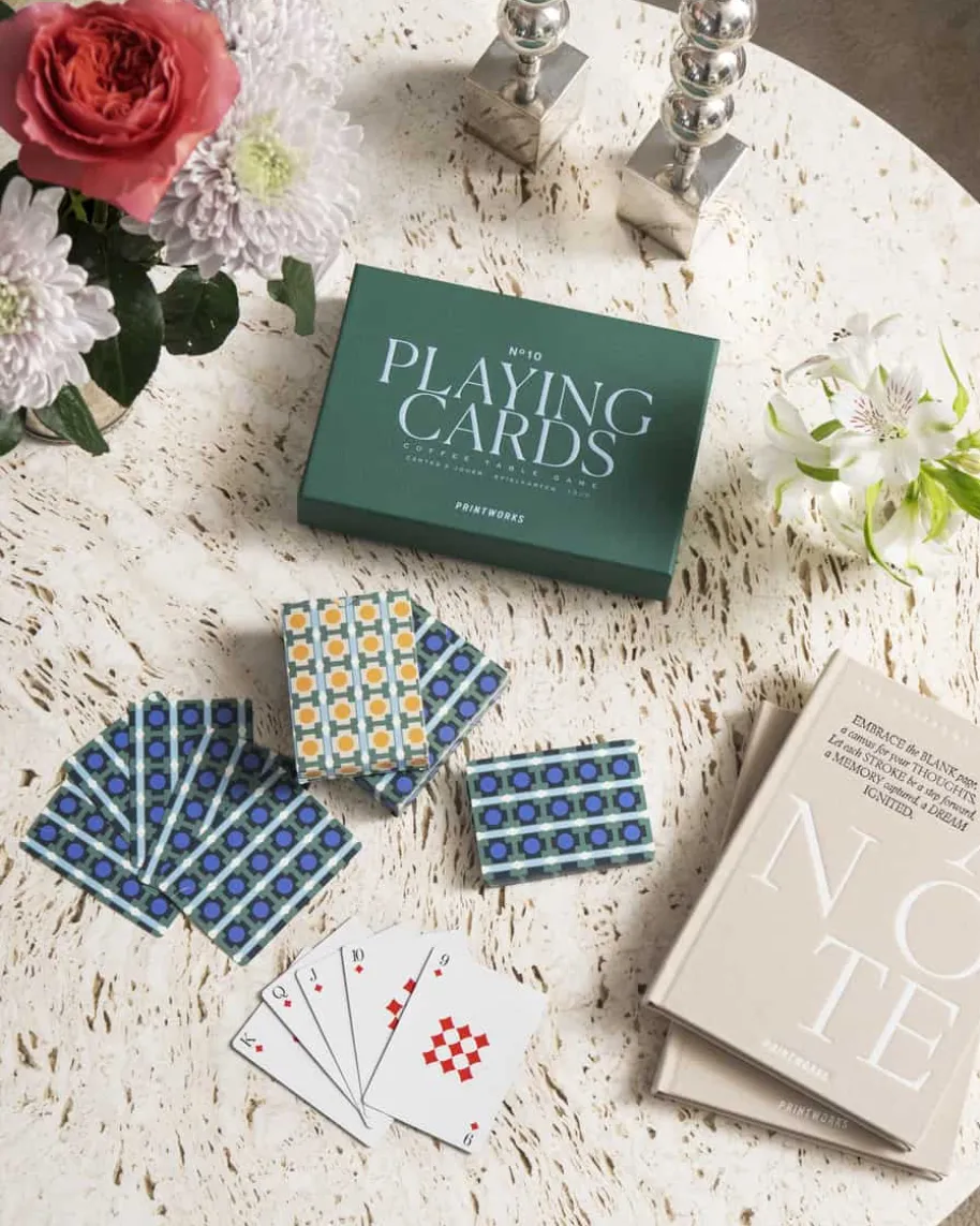 Spielkarten von Printworks in Grün und Bunt. DiesesklassischeDoppelspielkarten in stilvollen Touch, überzeugen mitraffinierter Farbpaletteund einzigartigen Grafiken, während sie Ihrem Zuhause einelebendige Noteverleihen egal ob beim Spiel oder zu dekorativen Zweck.