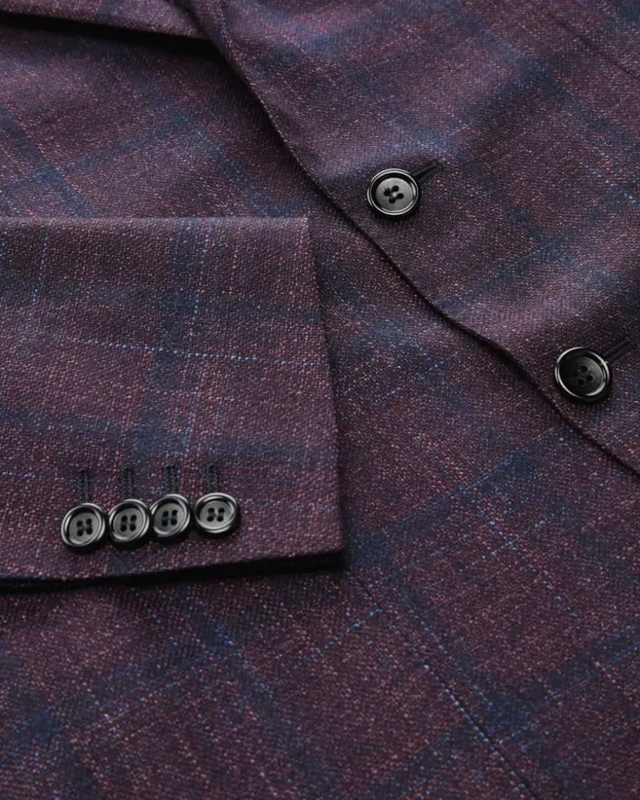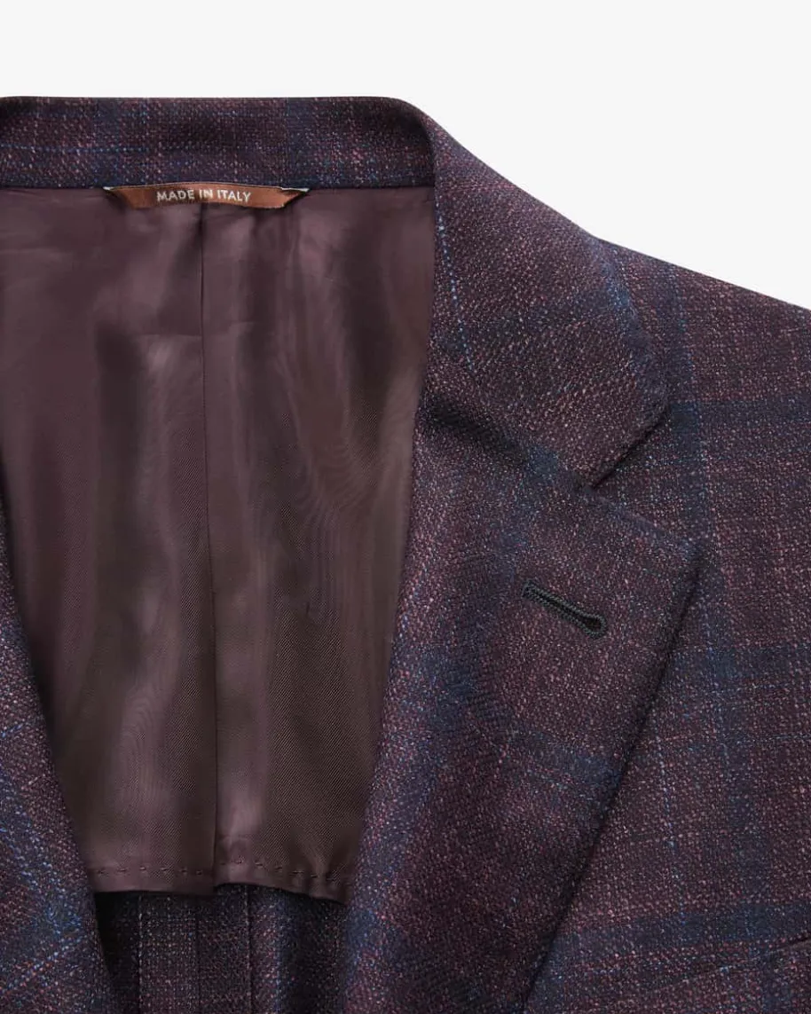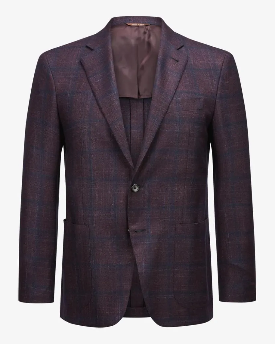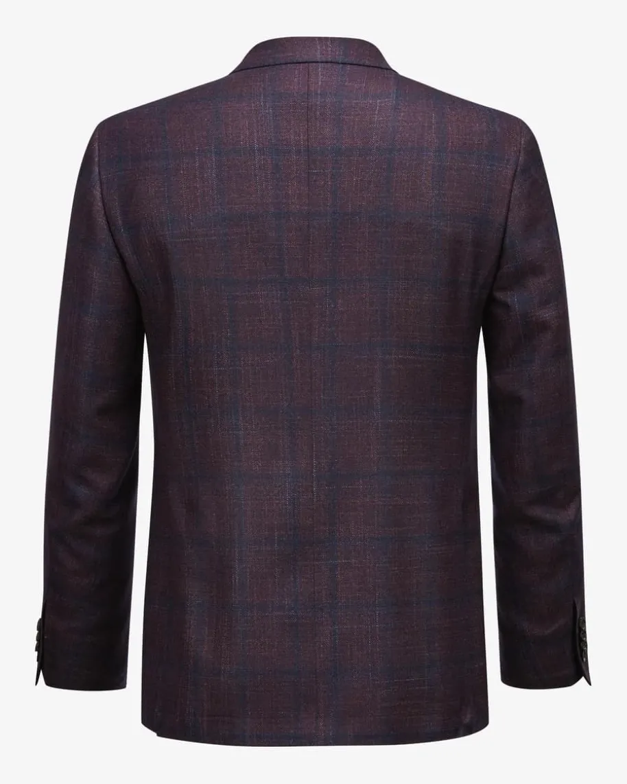 Kei Sakko für Herren von Canali in Bordeaux und Dunkelblau. Die Kei-Linie stehtfür aufgelockerte Schneiderkunst mit einer Silhouette ohne Beschränkungen ineiner Einheit aus Eleganz und Komfort – Das teilgefütterte Modell begeistertdank hochwertigem Woll-Mix mit Seiden- und Cashmere-Anteil mit angenehm-weicherHaptik. Das strukturierte Karomuster und klassische Details runden denstilvollen Look gekonnt ab.