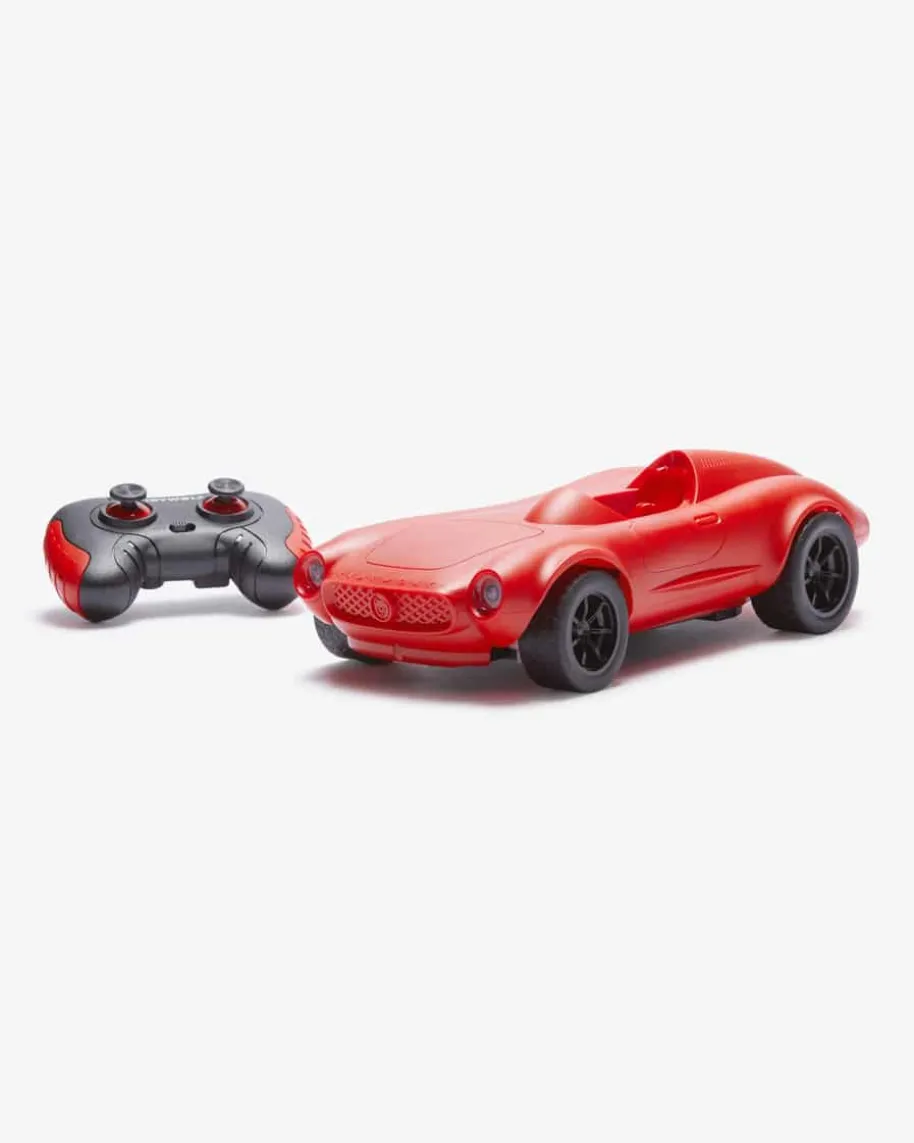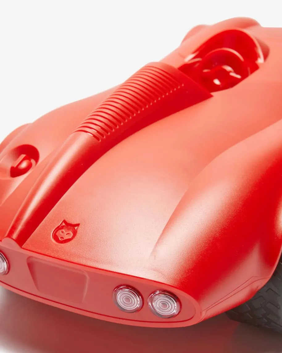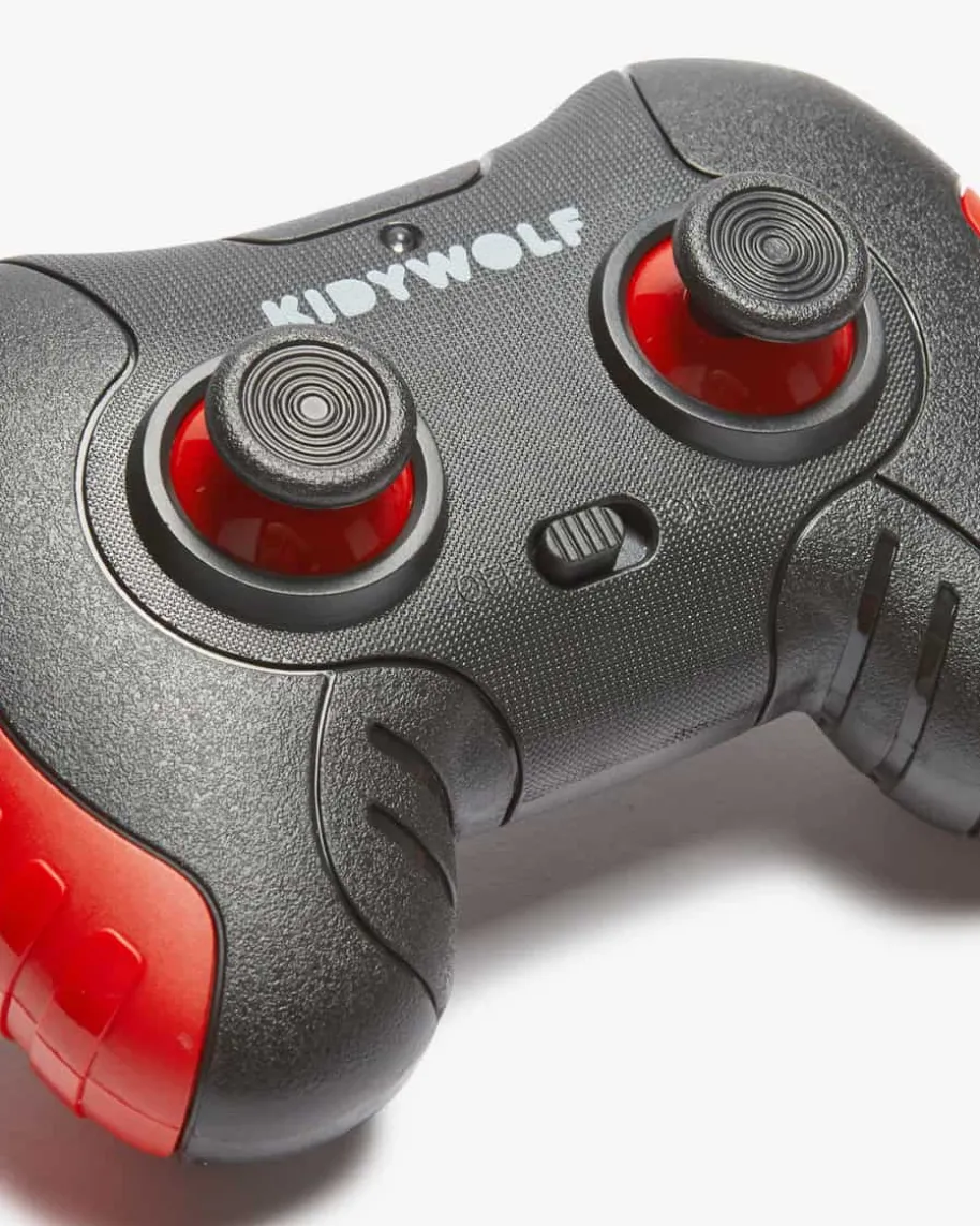 KIDYCAR-Auto von Kidywolf in Rot. Das ferngesteuerte Modell begeistert dank desikonischen Designs sowie zahlreichen Stickern Klein und Groß, während dersportive Hinterradantrieb mit gummierten Reifen lebensechte Drifts ermöglicht.