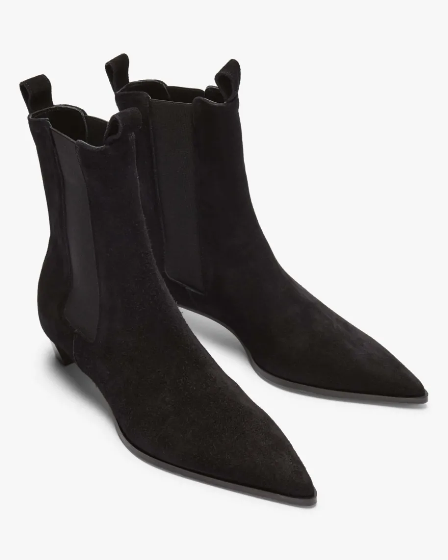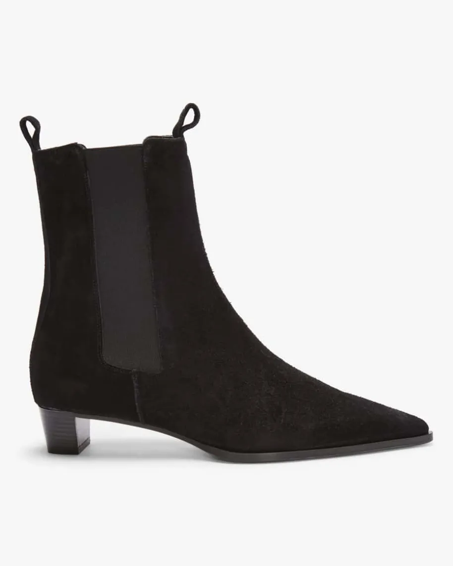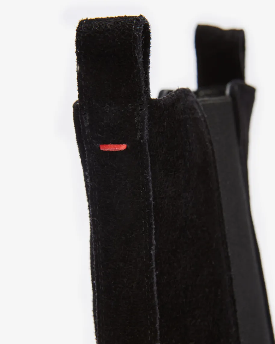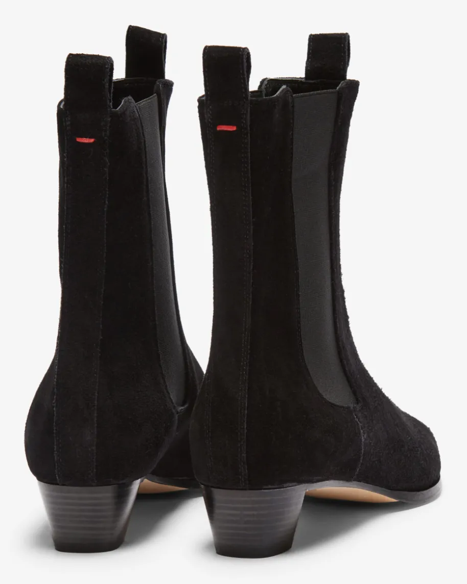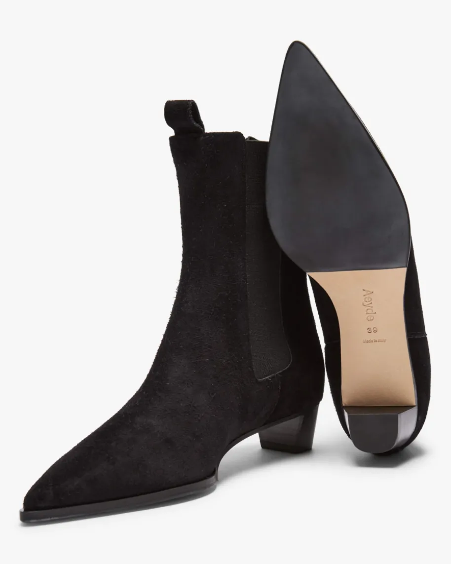 Kiki Stiefeletten für Damen von Ayede in Schwarz. Dank der Verwendung vonweichem Kalbsvelours entsteht ein hochwertiger Schuh, während die Cowboystiefel-Silhouette mit dezentem, abgeschrägtem Absatz und spitzer Form einen modischenEquestrian-Charakter verleiht. Zugleich sorgen die seitlichen Stretch-Einsätzesowie Zugschlaufen für ein einfaches An- und Ausziehen.