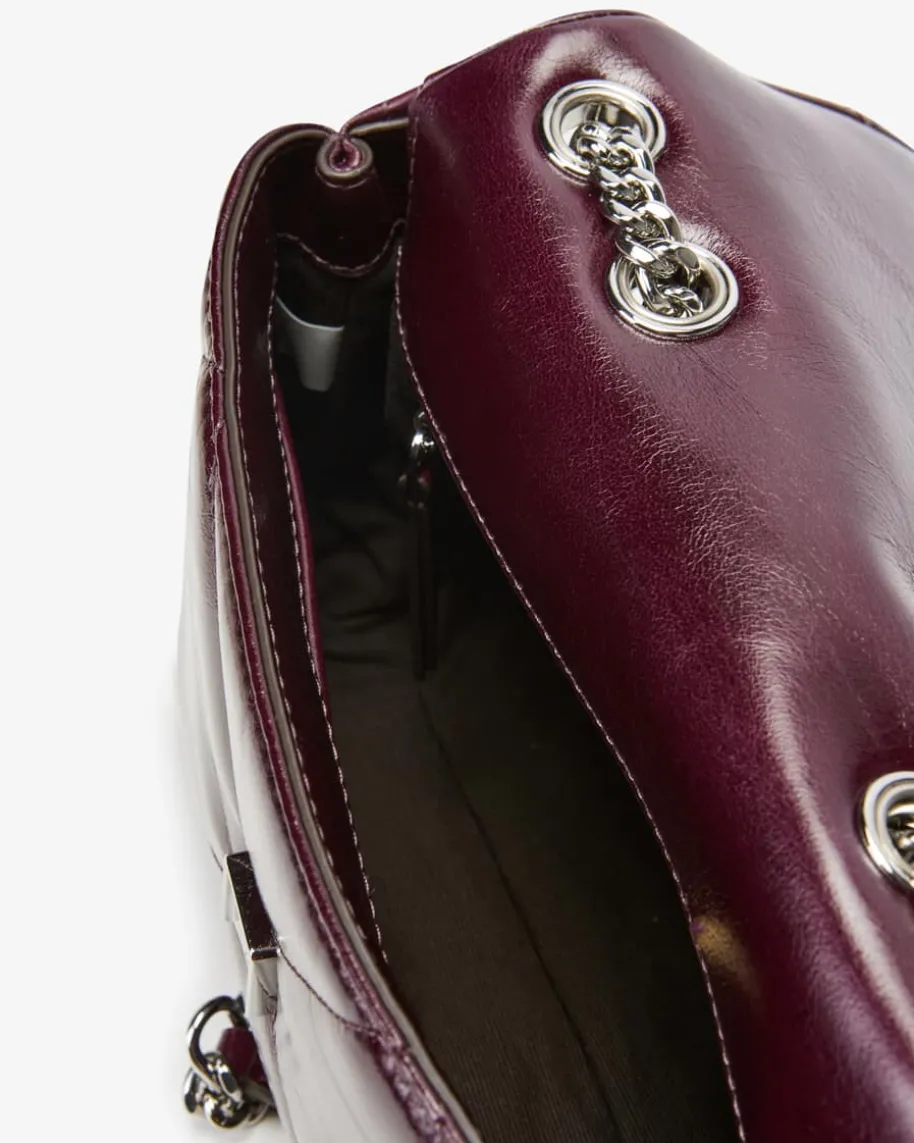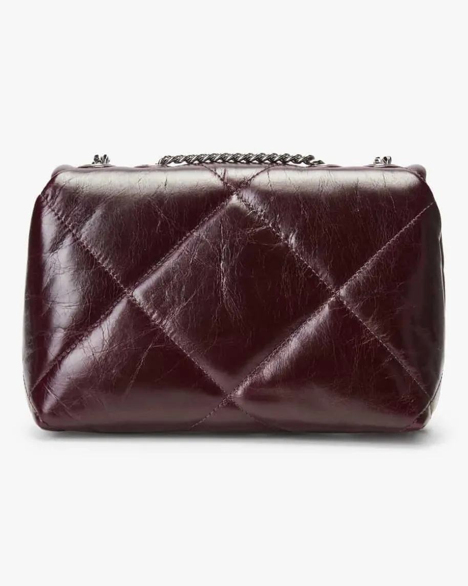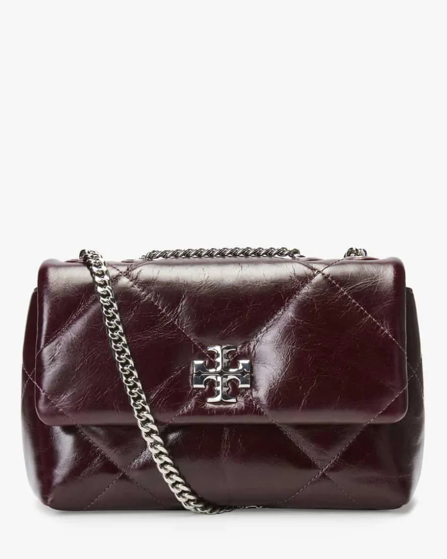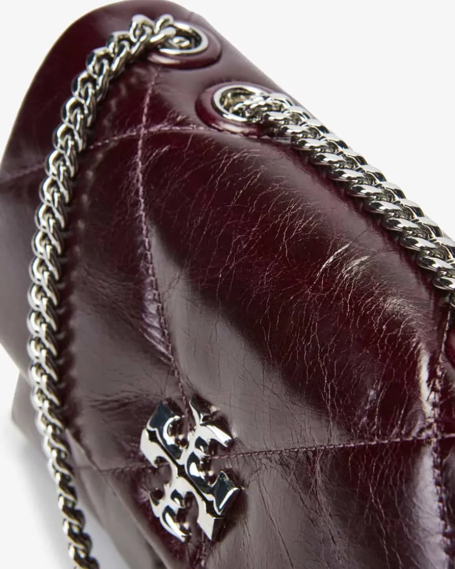 Kira Diamond Umhängetasche für Damen von Tory Burch in Bordeaux. Das eleganteLeder-Modell besticht mit modernem Rautenstepp-Muster und Crinkle-Optik, währenddie Gliederkette vielseitige Tragemöglichkeiten bereithält. Das silberfarbeneLogo-Emblem ergänzt das abendliche Accessoire gekonnt.