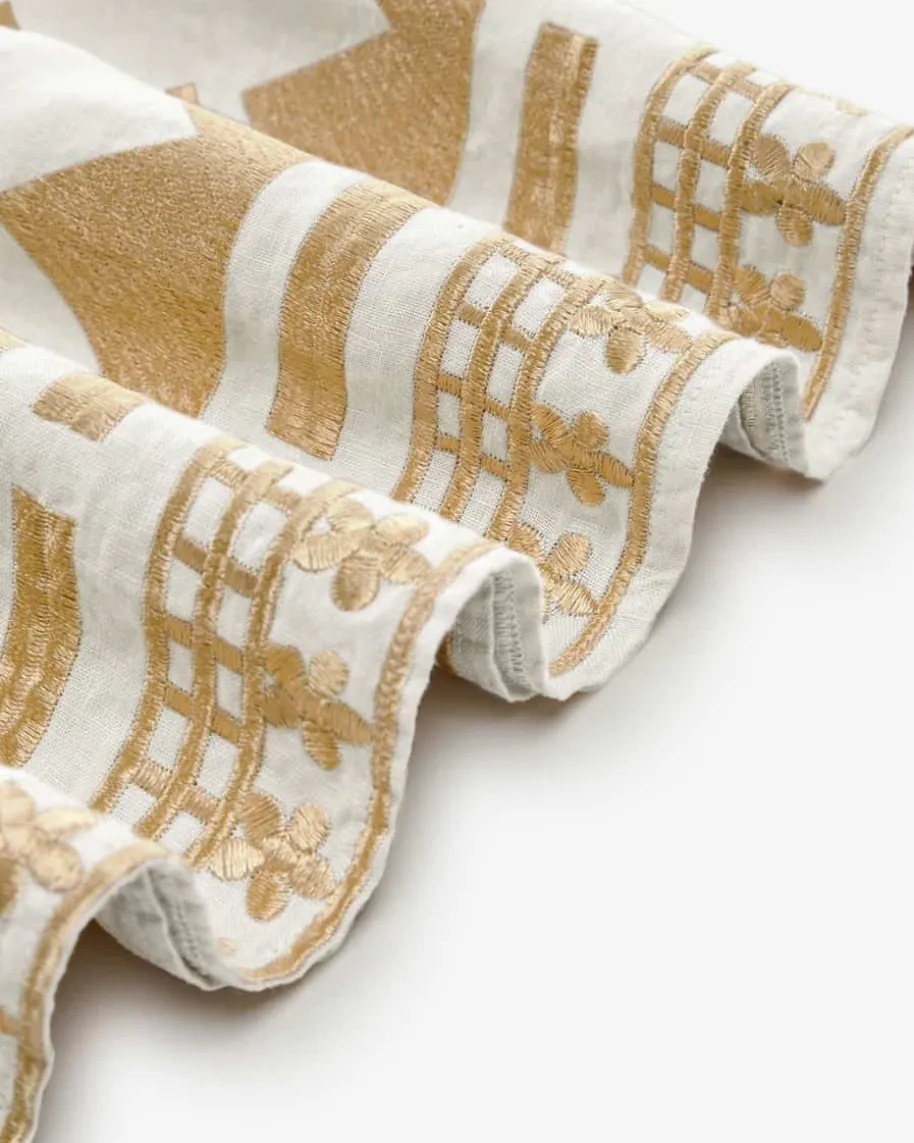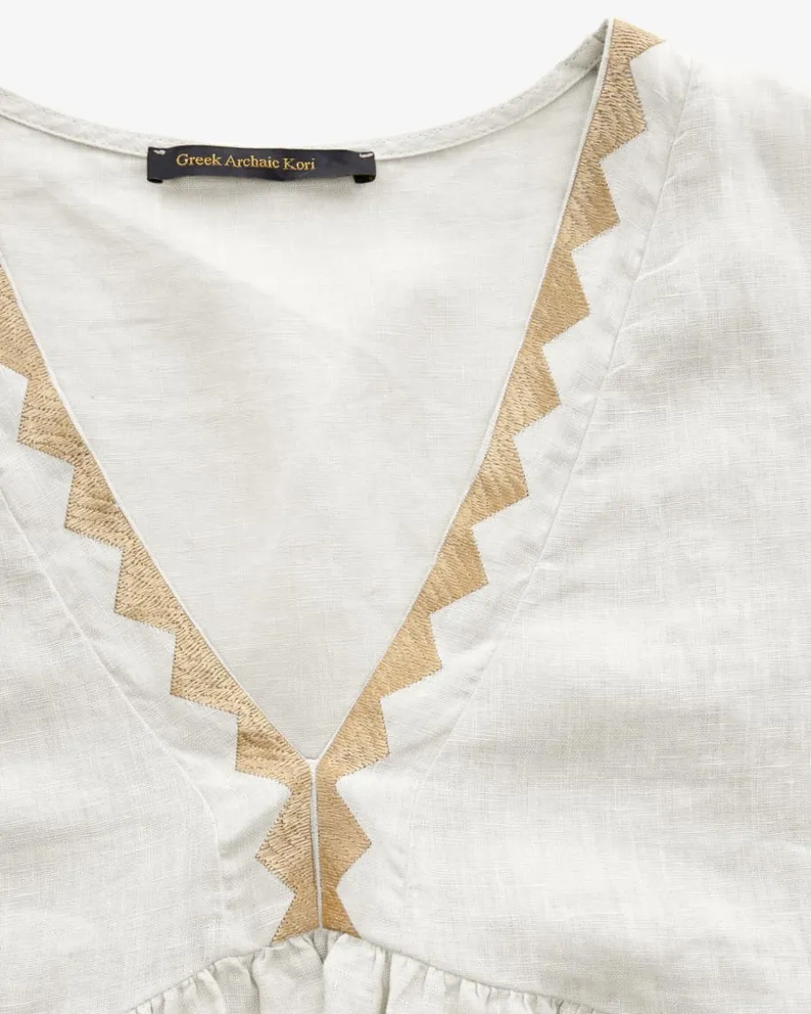 Kleid für Damen von Kori in Sand und Gold. Das Modell präsentiert sich inausgestellter Passform, während die Stickereien besondere Akzente setzen. Dieedle Leinen-Qualität sorgt zudem für einen angenehmen Tragekomfort.