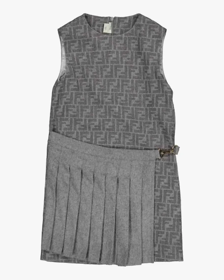Kleid für Mädchen von Fendi Kids in Grau. Dieses stylische Modell verzaubert mitedler Woll-Mix-Qualität und tonalem Allover-Logo-Dessin. Der aufgesetzteFaltenrock mit goldfarbenem Karabiner-Verschluss vollendet den Gesamtlookmodisch.