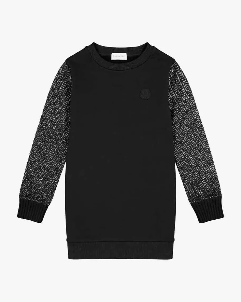 Kleid für Mädchen von Moncler Enfant in Schwarz. Das Modell begeistert mit derweichen Baumwoll-Verarbeitung, während die Logo-Applikation auf der Front sowiedie Ärmel mit Glitzerfasern besondere Akzente setzen.