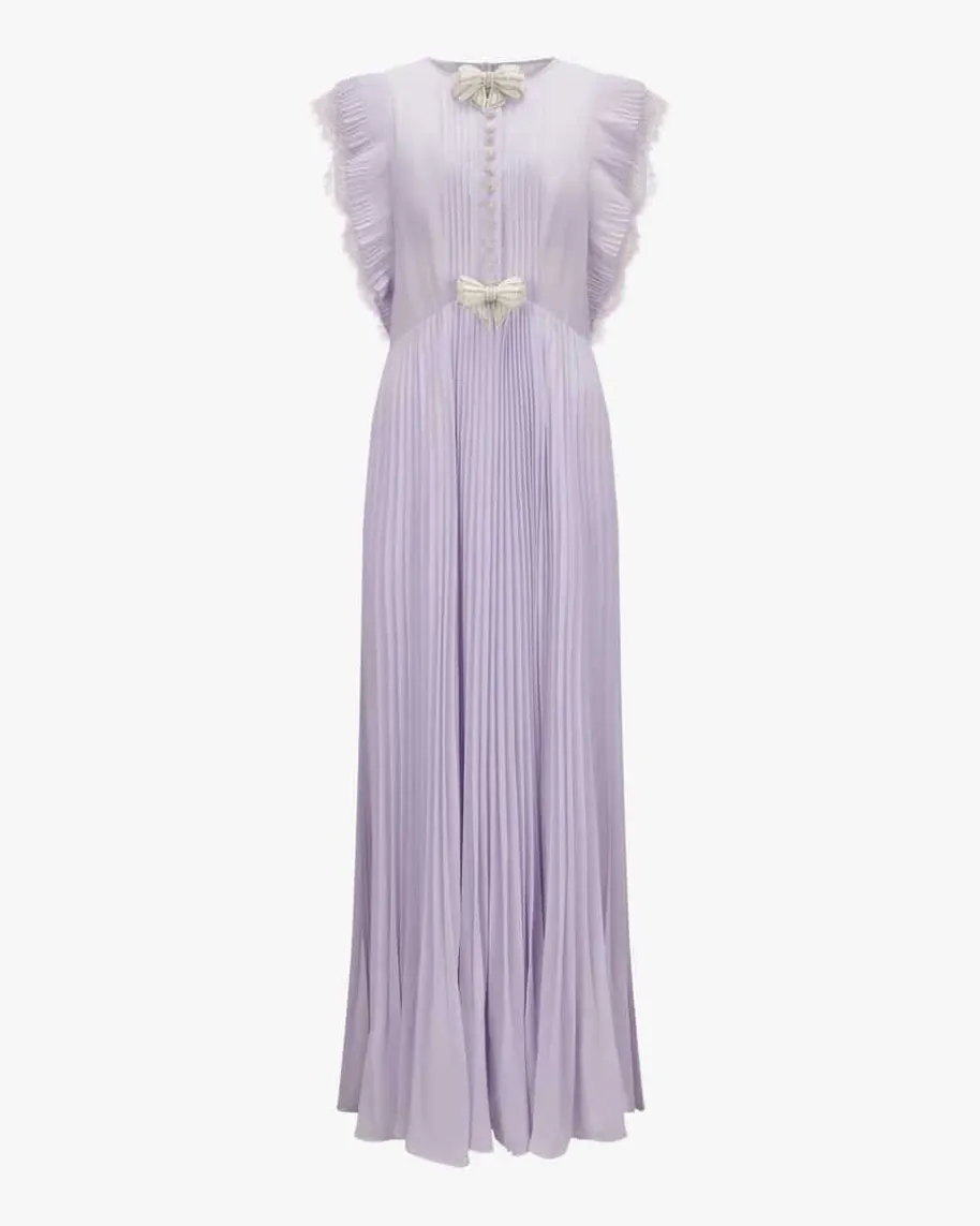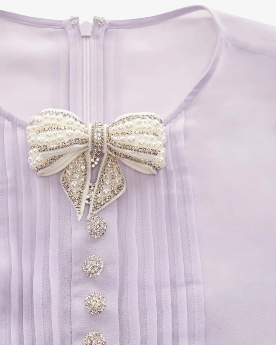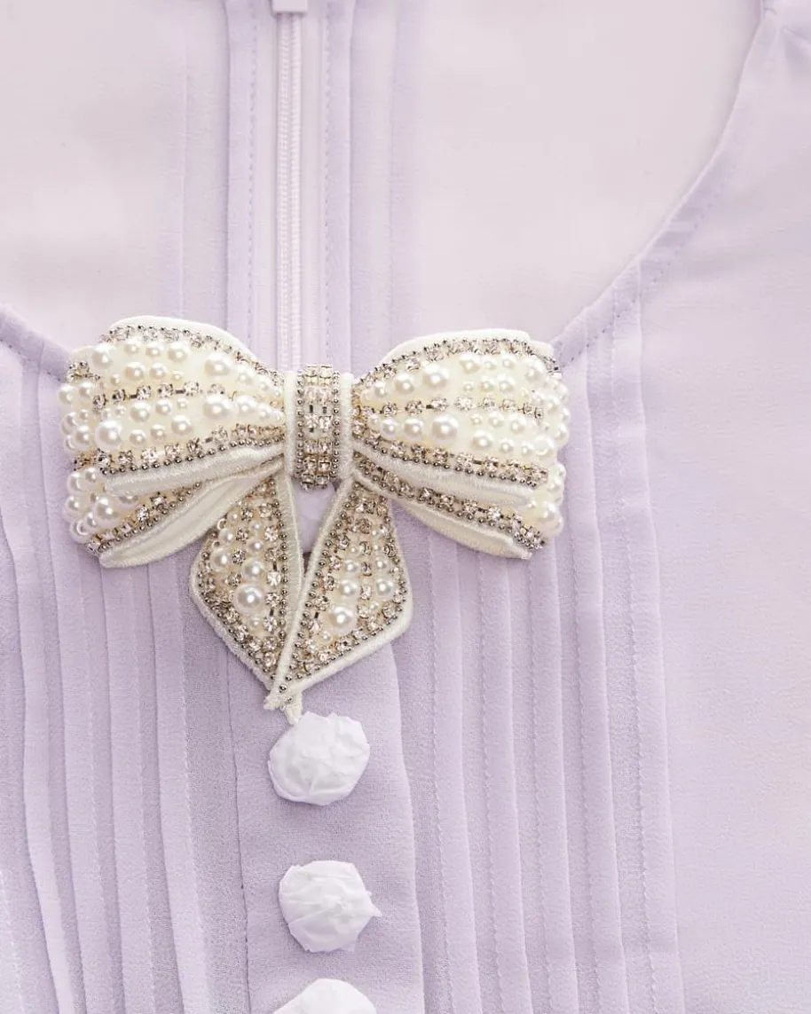 Kleid für Damen von Self-Portrait in Flieder. Das Modell präsentiert sich inzarter Plissée-Aufmachung, die durch die Spitzen-Details romantisch abgerundetwird. Die glitzernden Schmuckstein-Applikationen verleihen dem Look zudem eineneleganten Charakter, während die markanten Schleifen extravagante Akzentesetzen.
