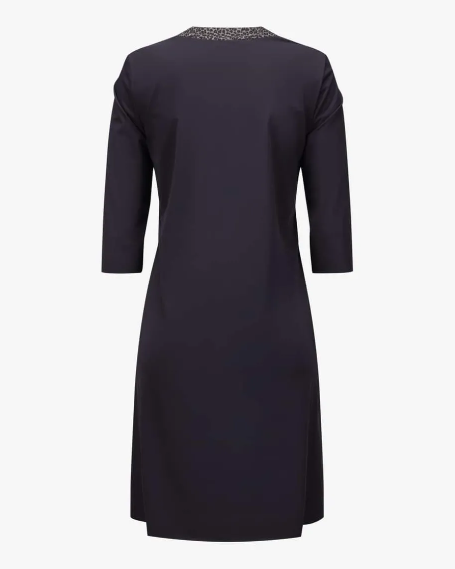 Kleid für Damen von Sportalm Emotion in Nachtblau, Beige und Schwarz. Das Modellüberzeugt mit elastischer und glatter Material-Qualität, die zusammen mit demmodischen Leo-Muster am Ausschnitt für einen femininen Charakter sorgt. DerTunika-Ausschnitt und feine Details runden den modischen Style gekonnt ab.