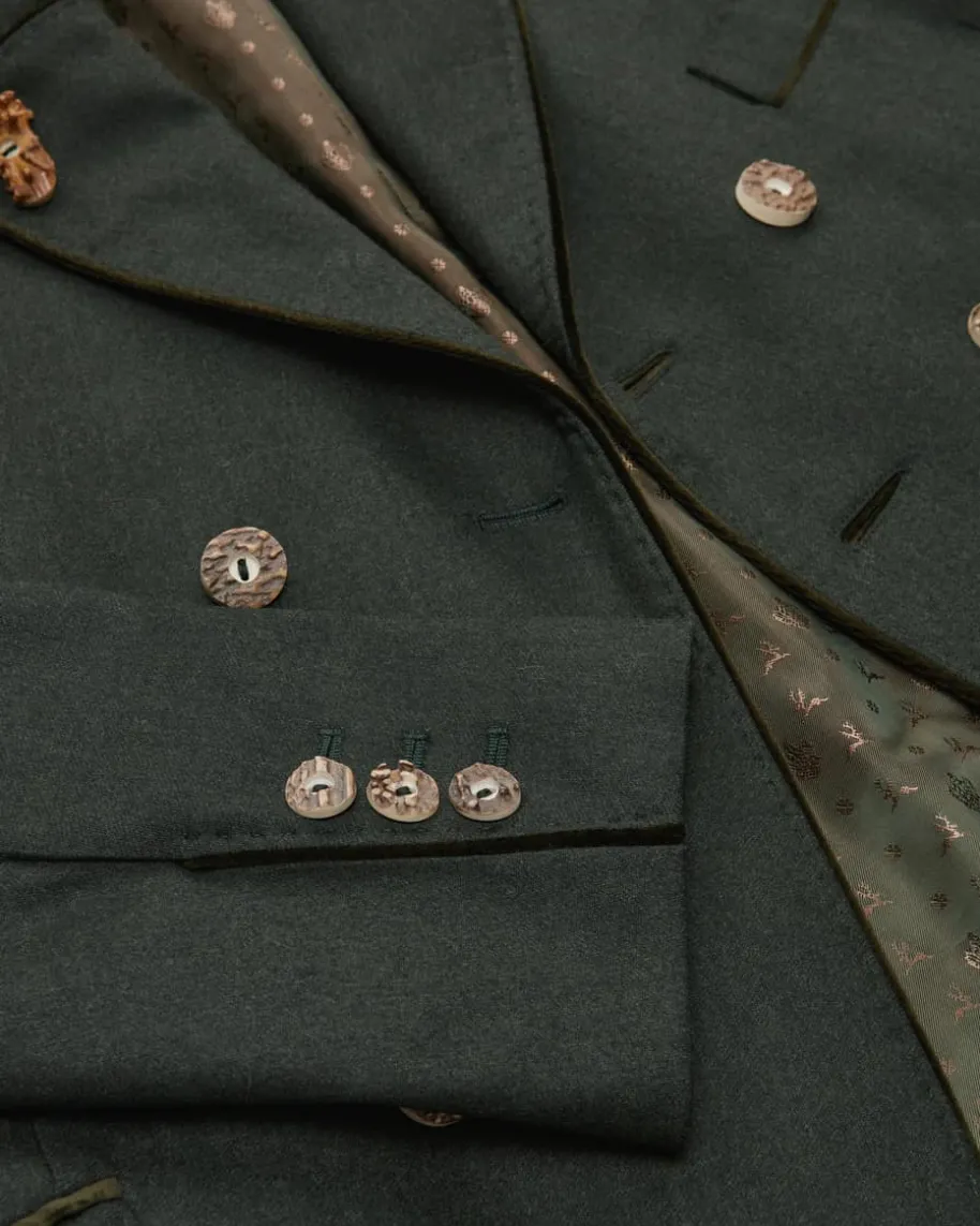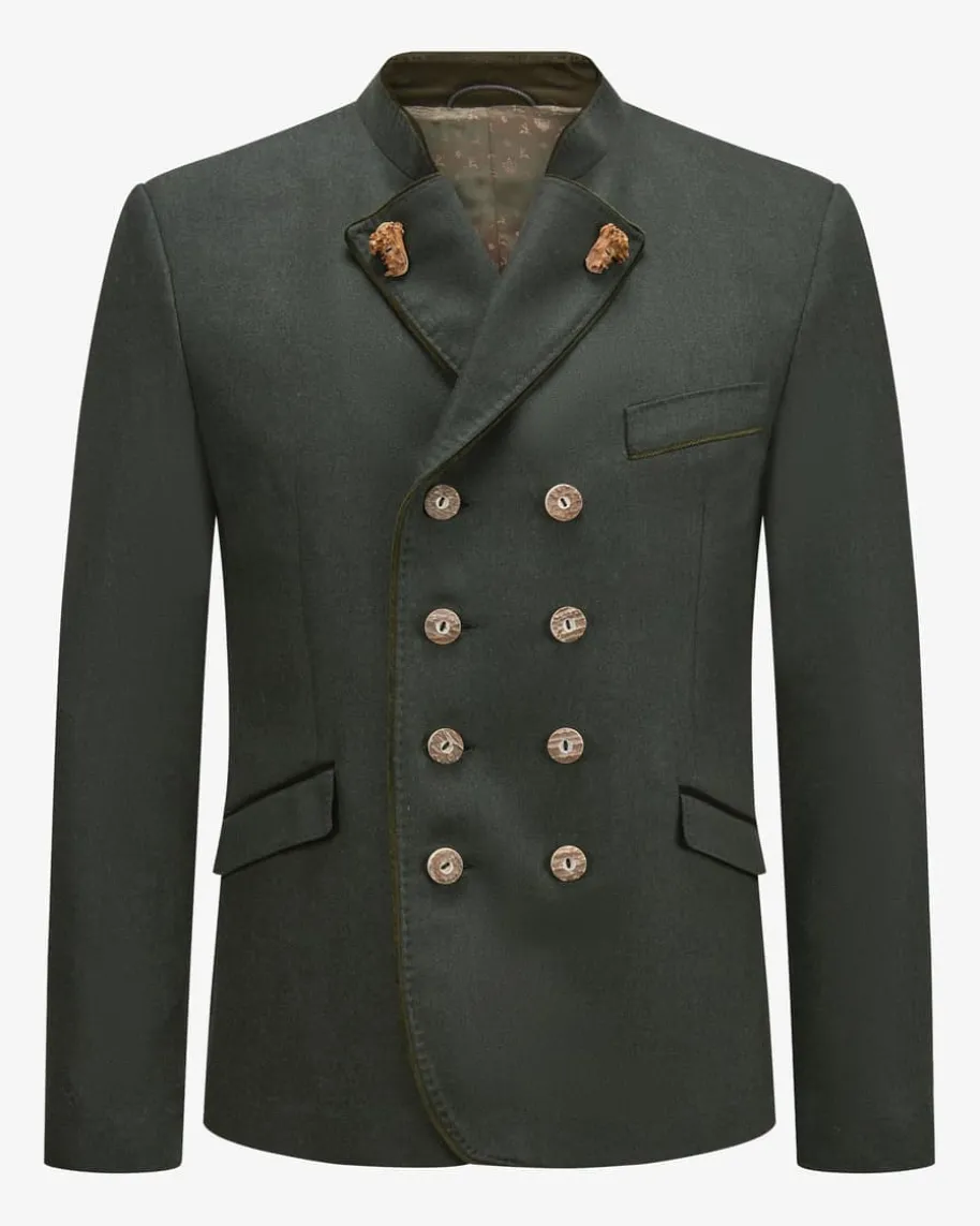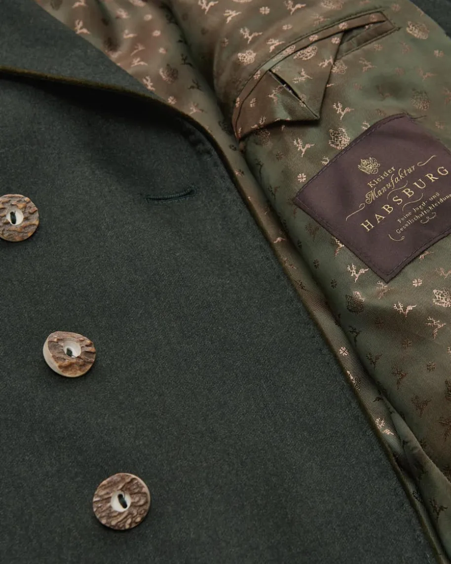 Kornegg Doppelreiher-Trachtenjanker für Herren von Habsburg in Dunkelgrün. DasModell aus hochwertiger Schurwolle präsentiert sich in traditionellerAufmachung, welche dank der rustikalen Hornknöpfe gekonnt untermalt wird.Zugleich vollenden die Wappen-Stickerei sowie weiche Samt-Paspelierungen denTrachten-Look harmonisch.