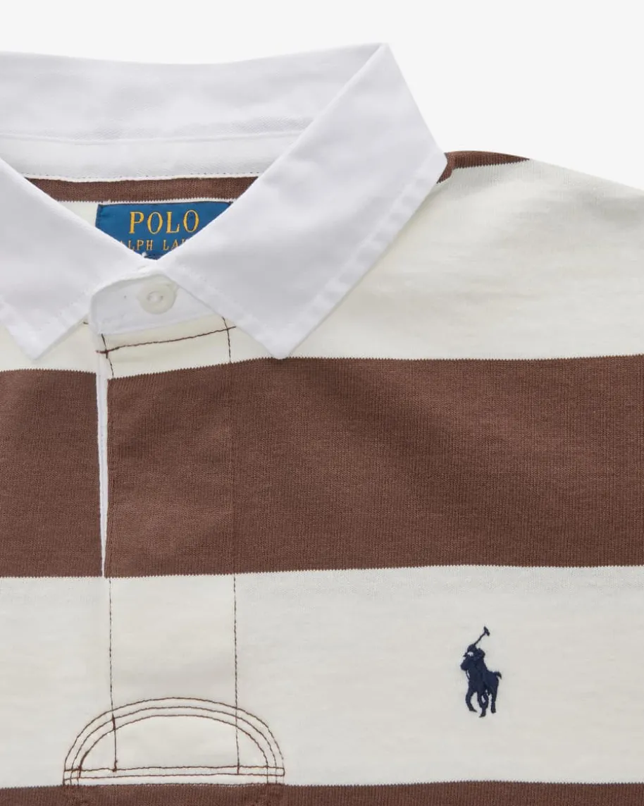 Langarm-Polo für Herren von Polo Ralph Lauren in Braun und Weiß. Das geradegeschnittene Rugby aus angenehmer Baumwolle erweist sich dank modischemStreifen-Dessin als legerer Favorit, während der Polo-Kragen mit verkürzterKnopfleiste, Rippstrick-Details als auch die charakteristische Logo-Stickereidas Gesamtbild klassisch ergänzen.