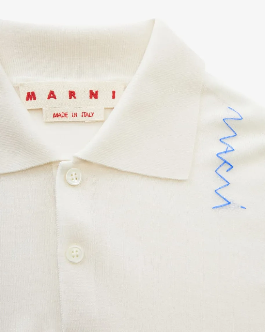 Langarm-Strickpolo für Herren von Marni in Creme. Luxuriöse Prêt-à-porter Stylesund ein einzigartiges Geschick für Farb- und Musterexperimente: Das ist dieEssenz der Luxusbrand Marni, welche die Kollektionen so begehrenswert undeinzigartig macht. Das Modell besticht durch die feine, semitransparente Woll-Strickverarbeitung mit leichtem Tragegefühl, während der Polokragen zusammen mitdem kontrastierenden Logo-Stick einen modernen Pullover mit besonderem Touchkreieren.