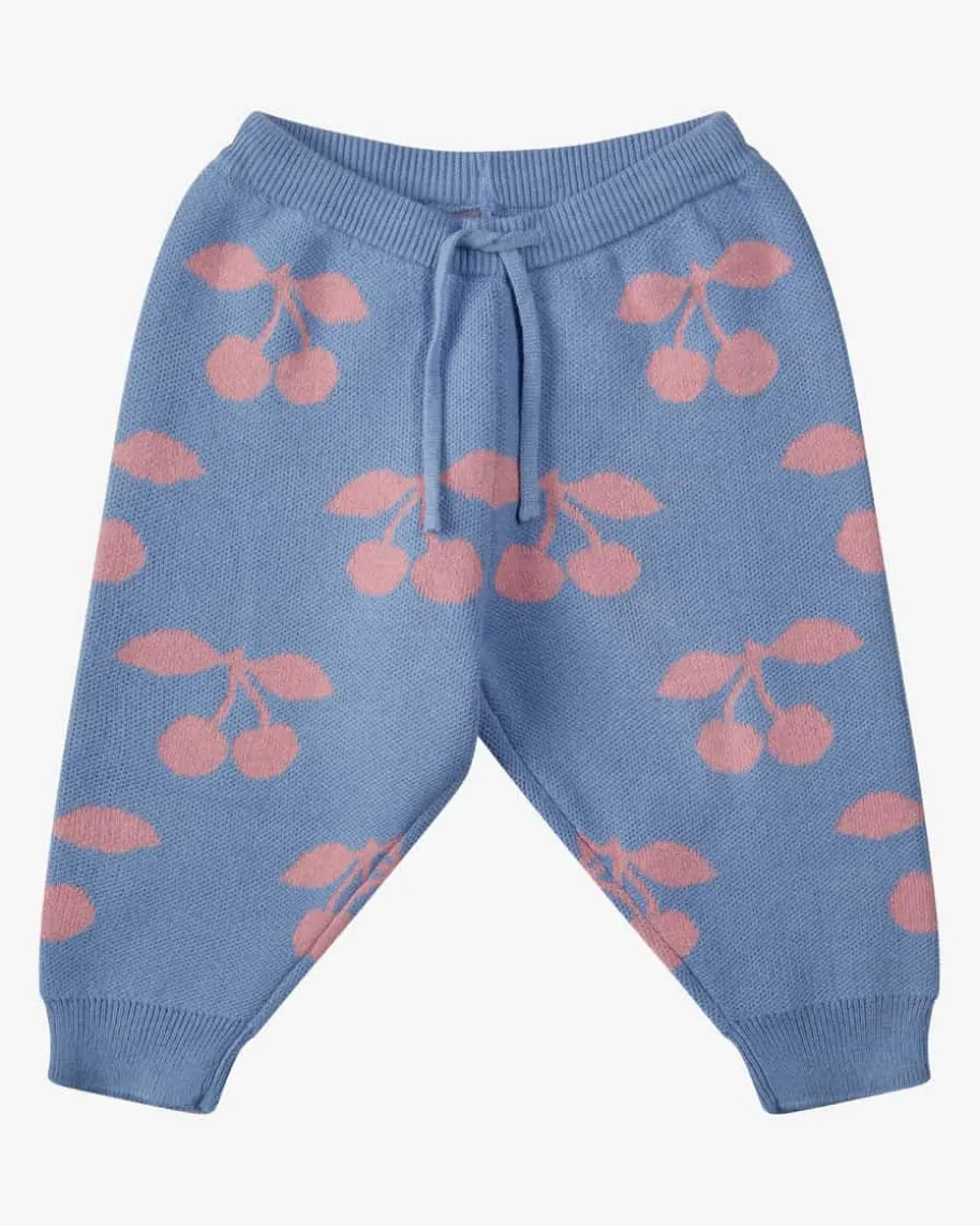Lapis Strickhose für Babys von Konges Slojd in Hellblau und Rosa. Das Modellpunktet mit dem hochwertigen Jacquard-Muster mit süßem Kirschen-Motiv, währenddie legere Passform mit elastischen Rippstrick-Bündchen den Style gekonntabrundet.