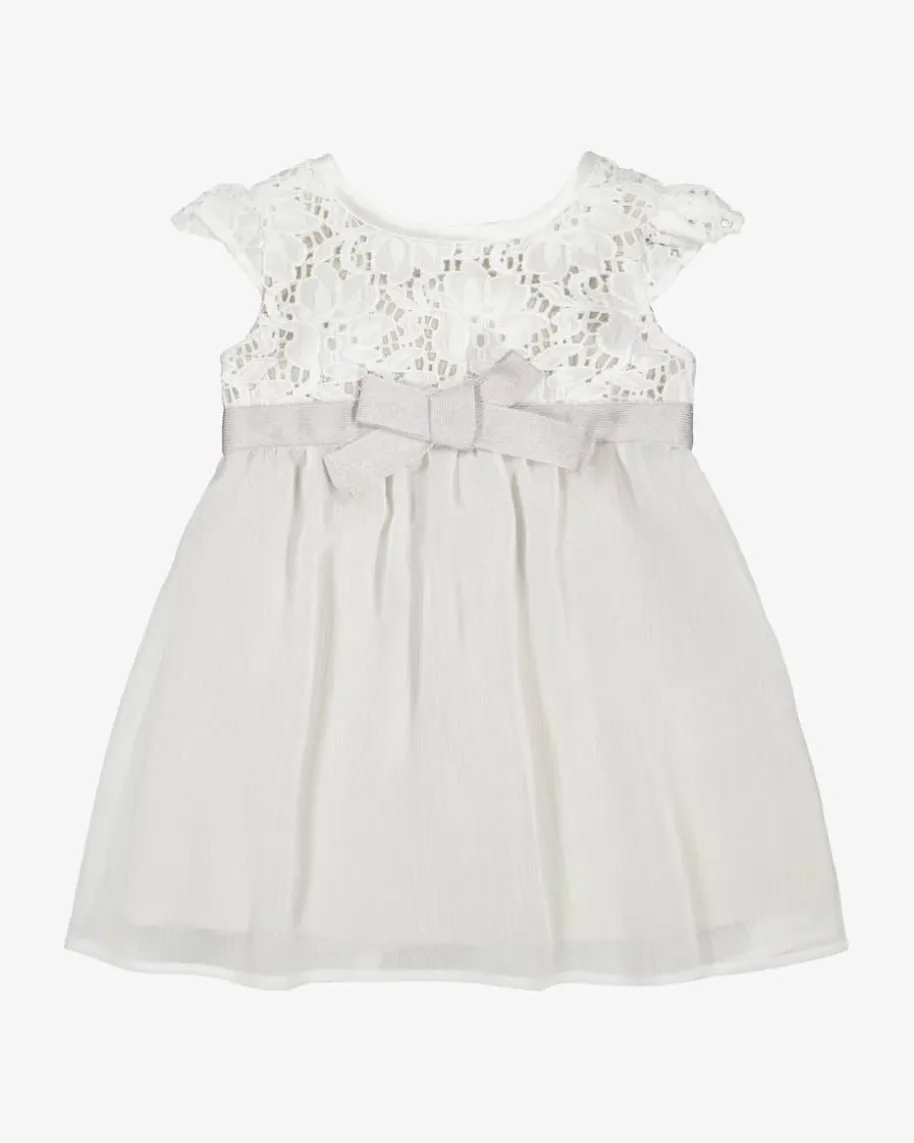Lea Baby-Kleid von Seidenweiss in Off-White, Stein und Hellgrau. Handmade withLove – Die Philosophie des Labels wird durch die Schleifen-Applikation, Spitzen-Details sowie dem semitransparenten Chiffon-Rock gekonnt widergespiegelt.Perfekt geeignet für festliche Anlässe!