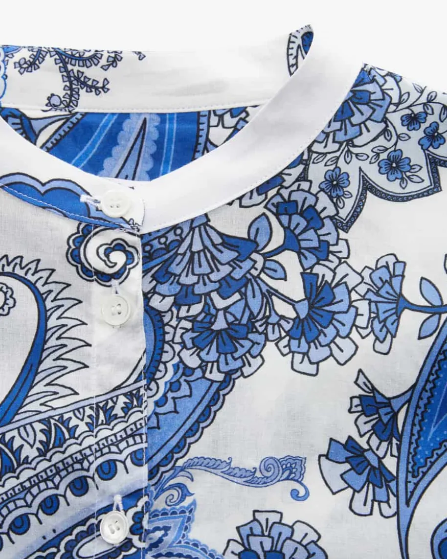 Lea Bluse für Damen von Robert Friedman in Blau und Weiß. Das Modell begeistertmit markantem Paisley-Dessin sowie Knöpfen in Perlmutt-Optik und avanciert dankweiter Passform zum modischen Highlight. Die leichte Baumwoll-Qualität sorgtzudem für einen angenehmen Tragekomfort.
