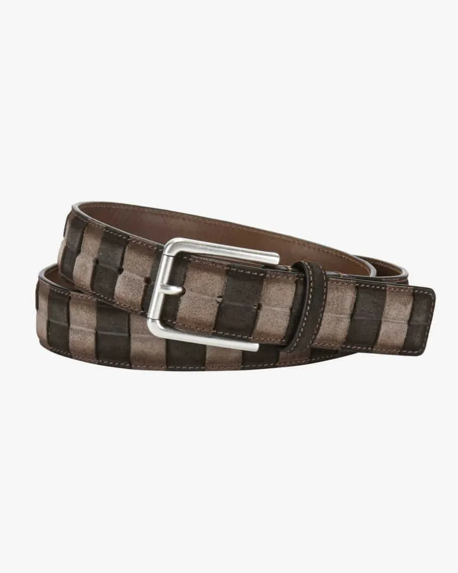 Ledergürtel für Herren von Veneta Cinture in Dunkelbraun und Hellbraun. Daszweifarbige Modell, gefertigt aus hochwertigem Velourleder, präsentiert sichdank der markanten Dornschließe in maskuliner Aufmachung, während dieraffinierte Flecht-Optik modische Akzente setzt.