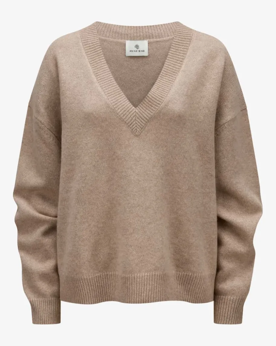 Lee Cashmere-Pullover für Damen von Anine Bing in Sand. Dank hochwertigerCashmere-Qualität überzeugt dieses Modell sowohl haptisch als auch optisch,während der legere Oversize-Fit einen modischen Look kreiert. Der tiefe V-Ausschnitt setzt zudem feminine Akzente.