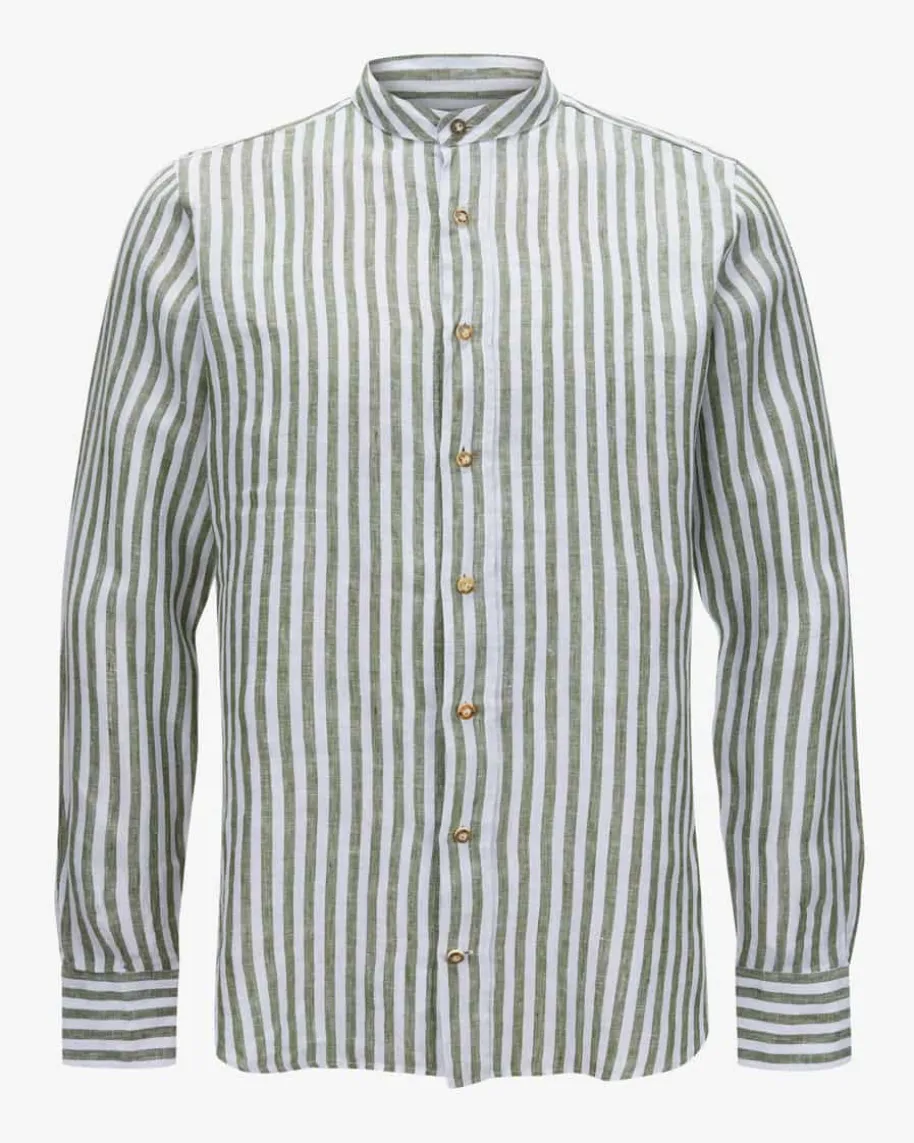 Leinen-Trachtenhemd für Herren von DU4 in Oliv und Weiß. Das luftige Modellbegeistert mit angenehmer Leinen-Qualität, modischem Streifen-Dessin undklassischen Details. Ein vielseitiger Begleiter für verschiedenste Anlässe.