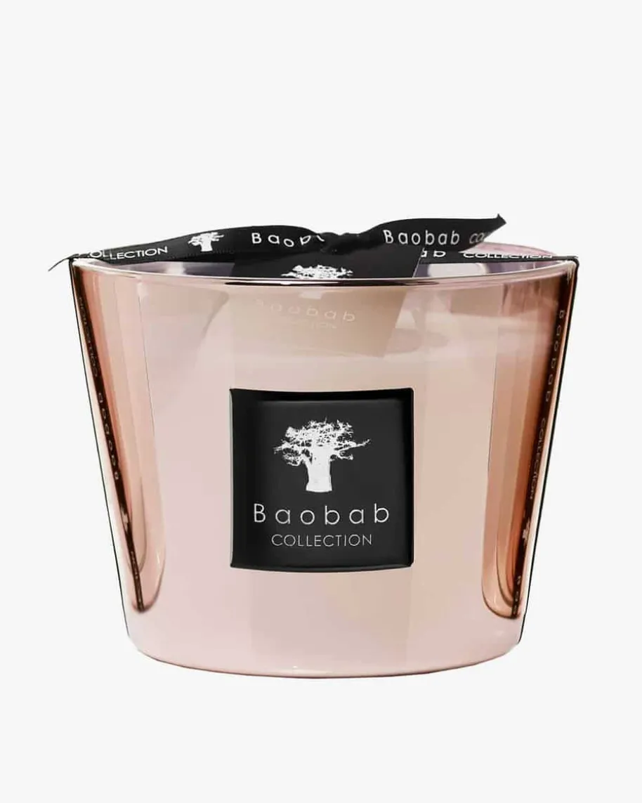 Les Exclusives Roseum Max 10 Kerze von Baobab. Diese Kerze besticht mit ihremwunderbaren Duft von Bergamotte und Moschus. Sie ist ein kostbares Designobjektdurch ihre puderrosa Metallisierung und zaubert so Stil in Ihr Wohn- undEsszimmer.