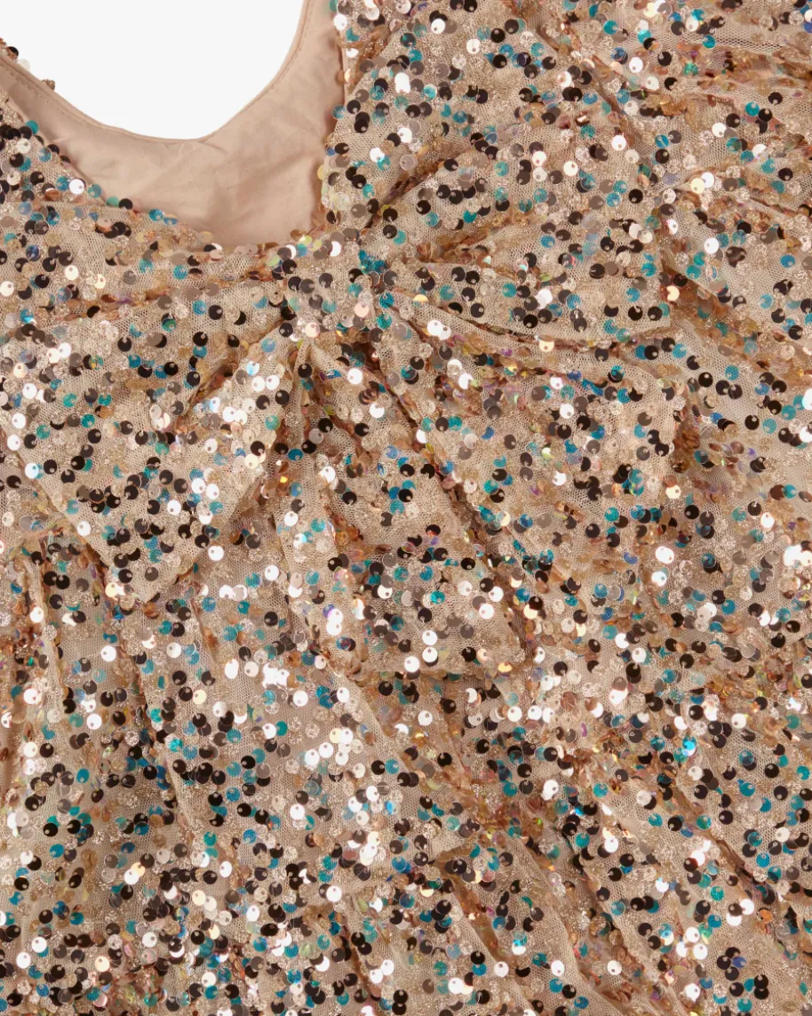 Lila Paillettenkleid für Babys von Konges Slojd in Gold. Das Modell punktet mitchangierender Pailletten-Verarbeitung, die einen einzigartigen Hingucker-Lookgarantiert. Die ausgestellte Passform mit süßen Volants rundet den edlen Lookharmonisch ab.