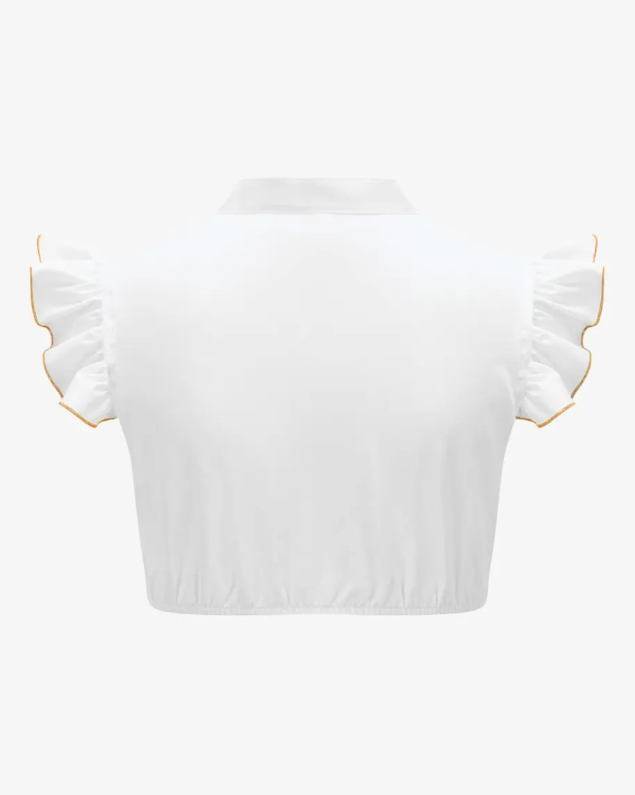 Lilly Dirndlbluse für Damen von Nicoletta Giacomelli in Weiß und Ocker. DieKreationen des Labels verbinden Tradition und Moderne und glänzen durch Eleganzund Raffinesse. Auch dieses Modell präsentiert sich dank angenehmem Baumwoll-Mixin traditioneller Aufmachung. Feminine Flügelärmel mit farbig abgesetzter Nahtsowie der schmale Stehkragen vervollständigen das Trachten-Design gekonnt.