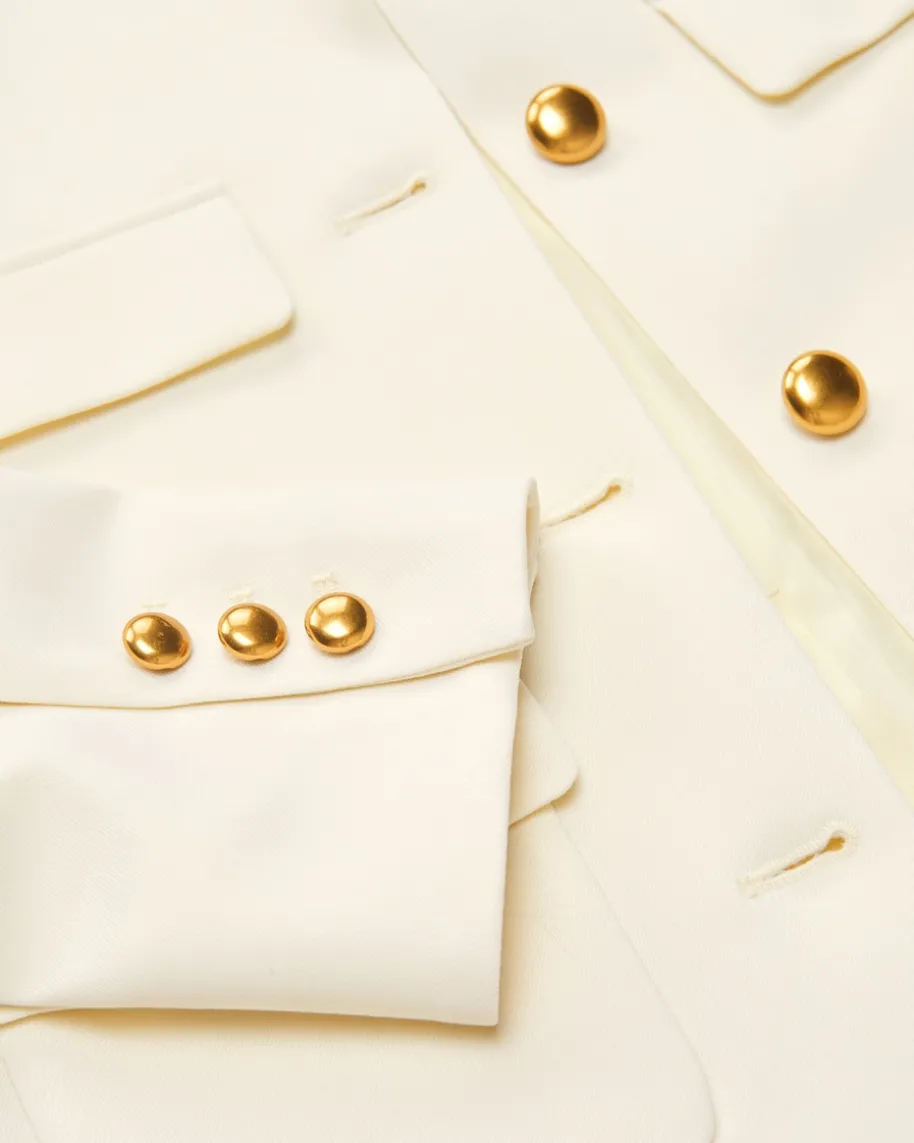 Liluxy25 Blazer für Damen von Parosh in Creme. Die Marke steht für verspielteDesigns mit Vintage-Flair – farbenfrohe Prints, Glitzer und Retro-Vibes made inItaly. Das Modell überzeugt in modernem Schnitt, während der hochwertigeSchurwoll-Mix für angenehme Tragemomente beschert. Die markanten goldfarbenenKugelknöpfe und zahlreichen Taschen kreieren einen besonderen Begleiter fürvielseitige Looks.