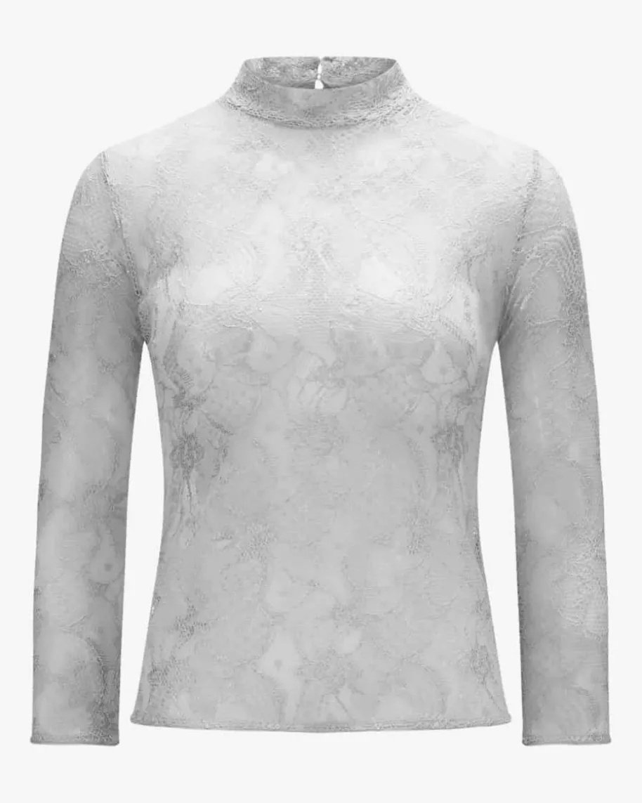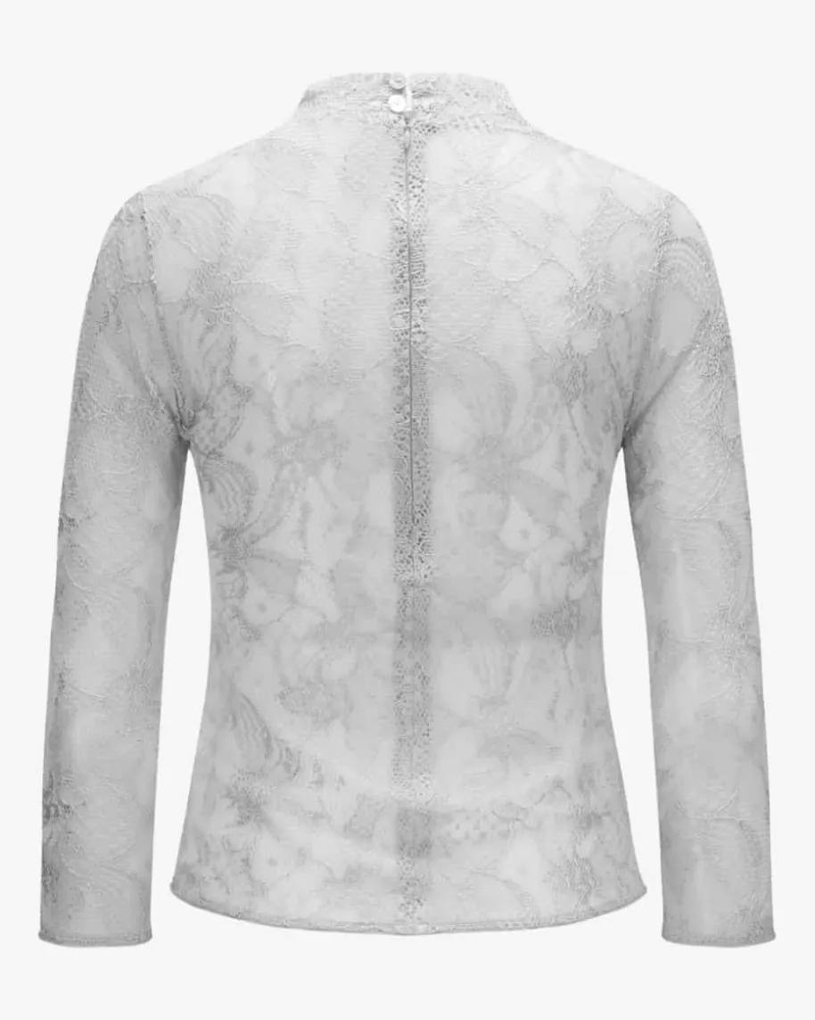 Lina Spitzenbluse für Damen von Kinga Mathe in Hellgrau. Das taillierte,hochgeschlossene Modell zeichnet sich durch die transparente Spitzen-Qualitätaus, welche dank feiner Paspelierungen stilvoll ergänzt wird. Auch zum Dirndleignet sich das Piece dank klassischer Details als stilsichere Wahl.