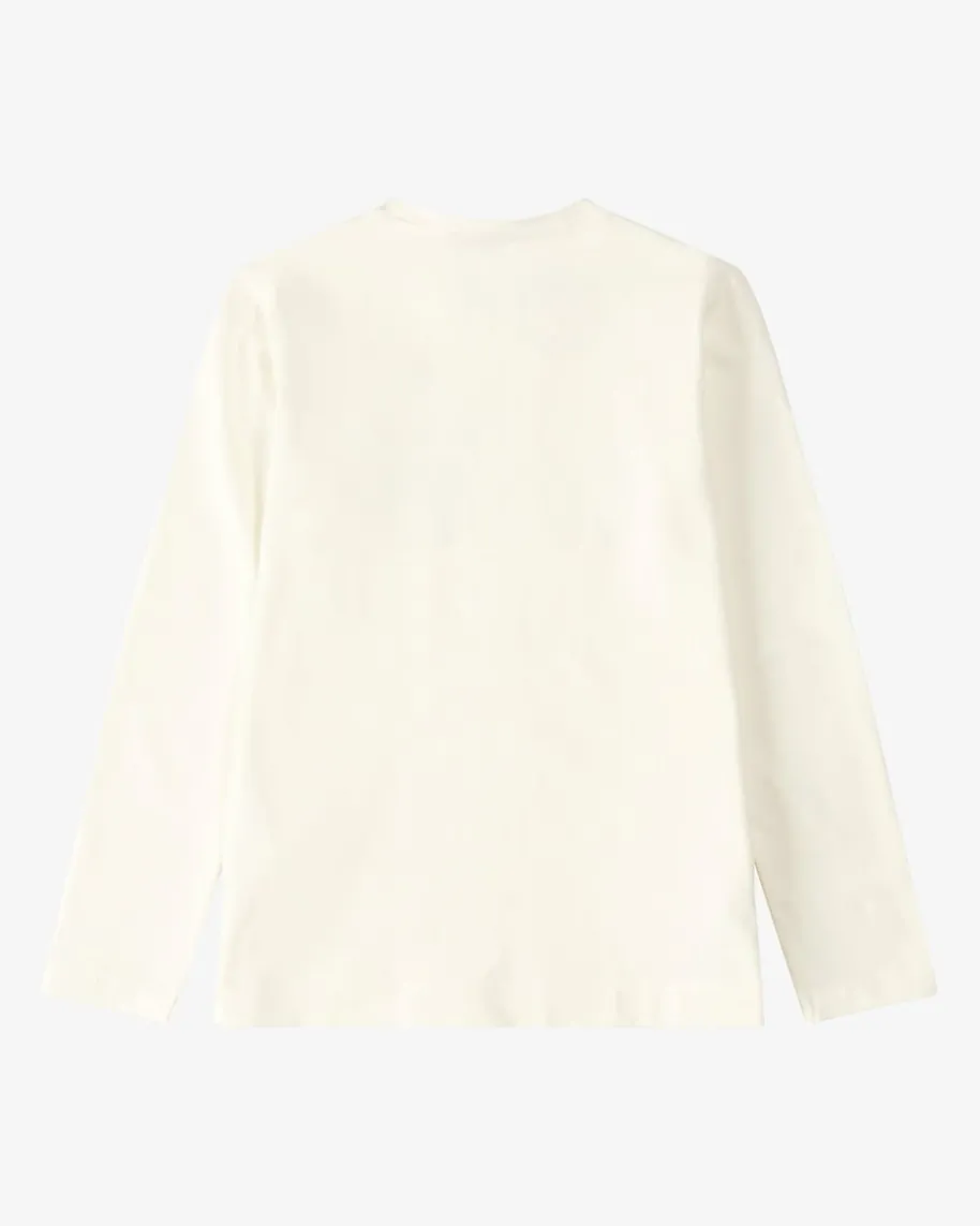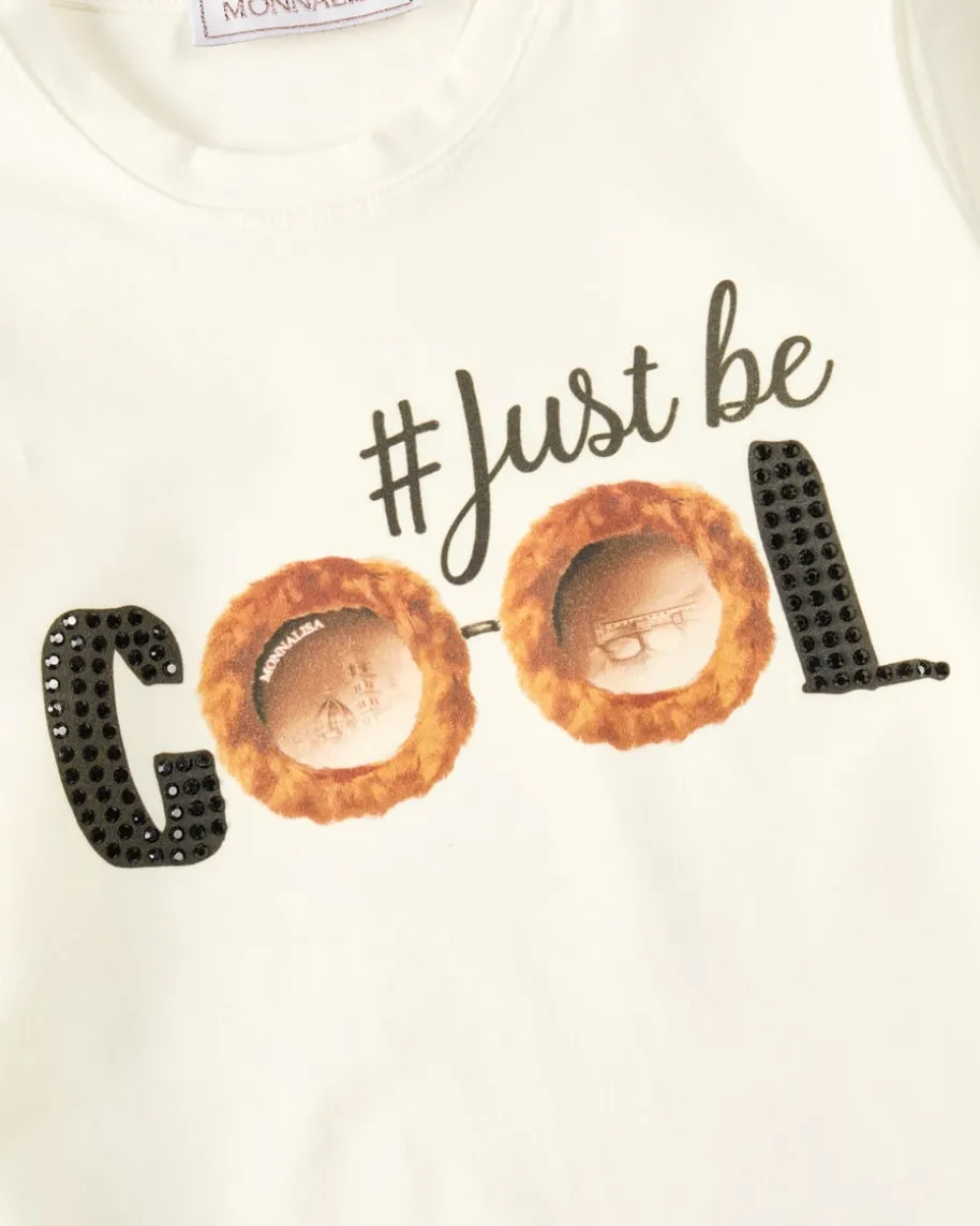 Longsleeve für Mädchen von Monnalisa in Weiß, Braun und Schwarz. Das Modellpräsentiert sich in verspielter Aufmachung dank des coolen Schriftzug-Print mitBrille, während die changierenden Glitzersteine für das gewisse Etwas sorgen.