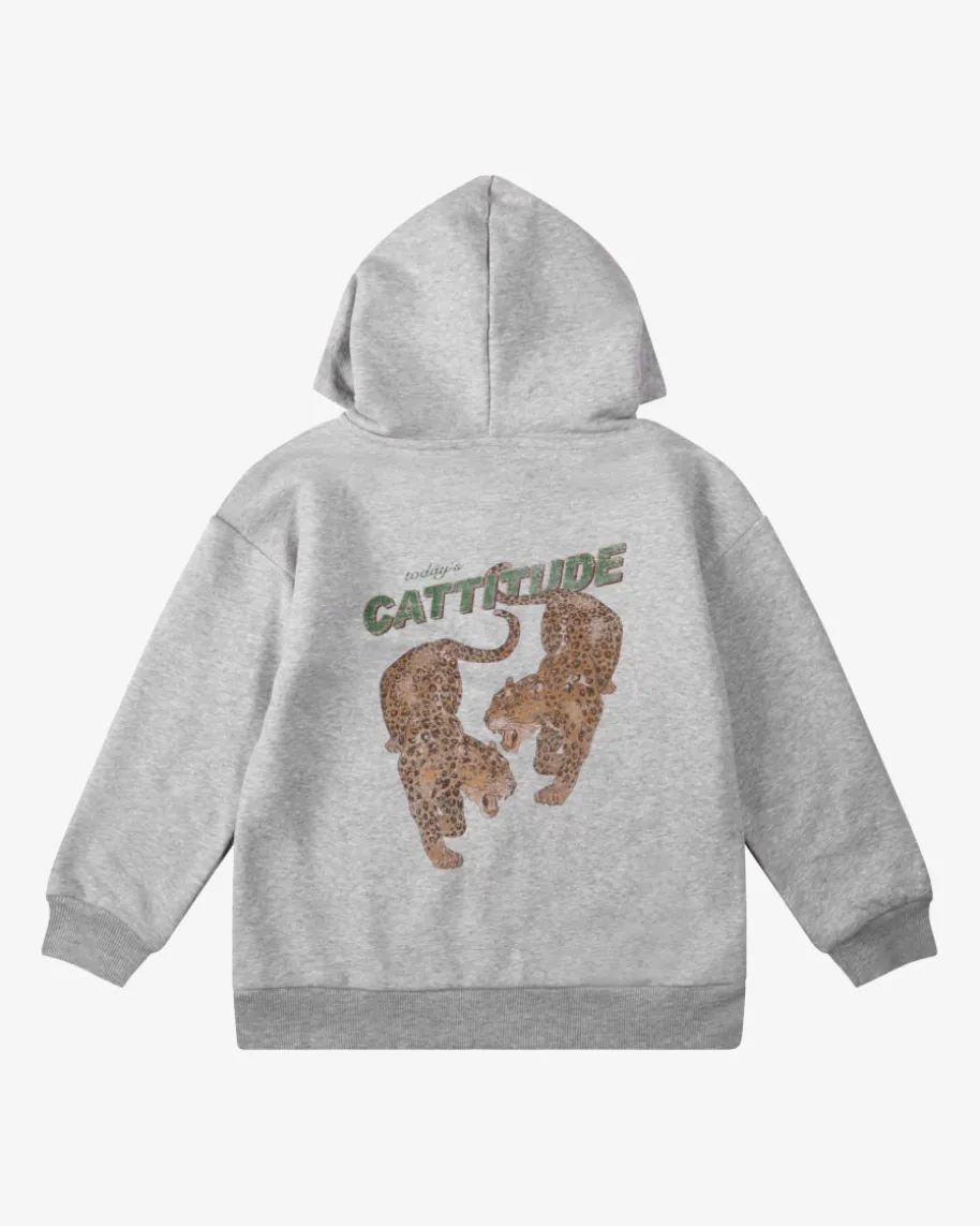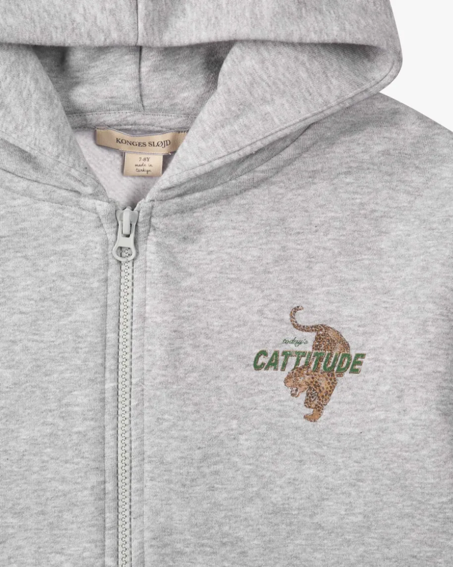 Lou Sweatjacke für Jungen von Konges Slojd in Hellgrau, Beige und Dunkelgrün.Das melierte Modell begeistert mit weichem Sweat-Material und hochwertiger Bio-Baumwolle, die einen weichen Griff verspricht. Der coole Leo-Print und sportiveRippstrick-Details runden den legeren Style harmonisch ab.