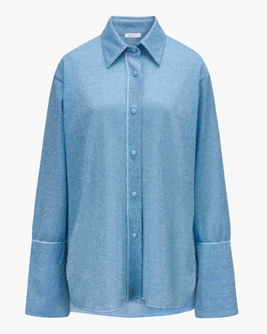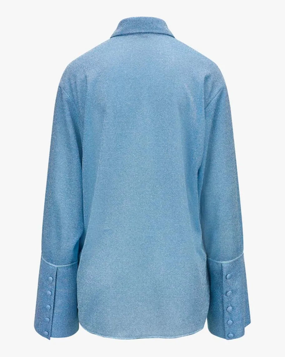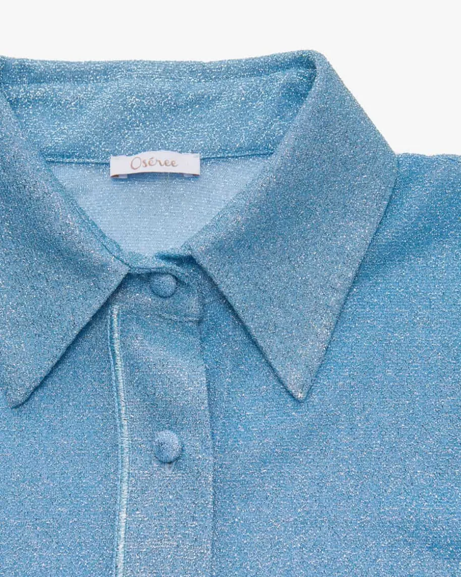 Lumiere Hemdbluse für Damen von Oséree in Türkis. Dank der extravagantenGlitzerfasern-Aufmachung in changierender Optik präsentiert sich das semi-transparente Modell mit modisch-femininem Flair, während die weite Passform mitklassischen Hemd-Details eine stilvolle Silhouette mit 70er-Jahre Touch kreiert.Das Modell kann mit der passenden Hose getragen werden.