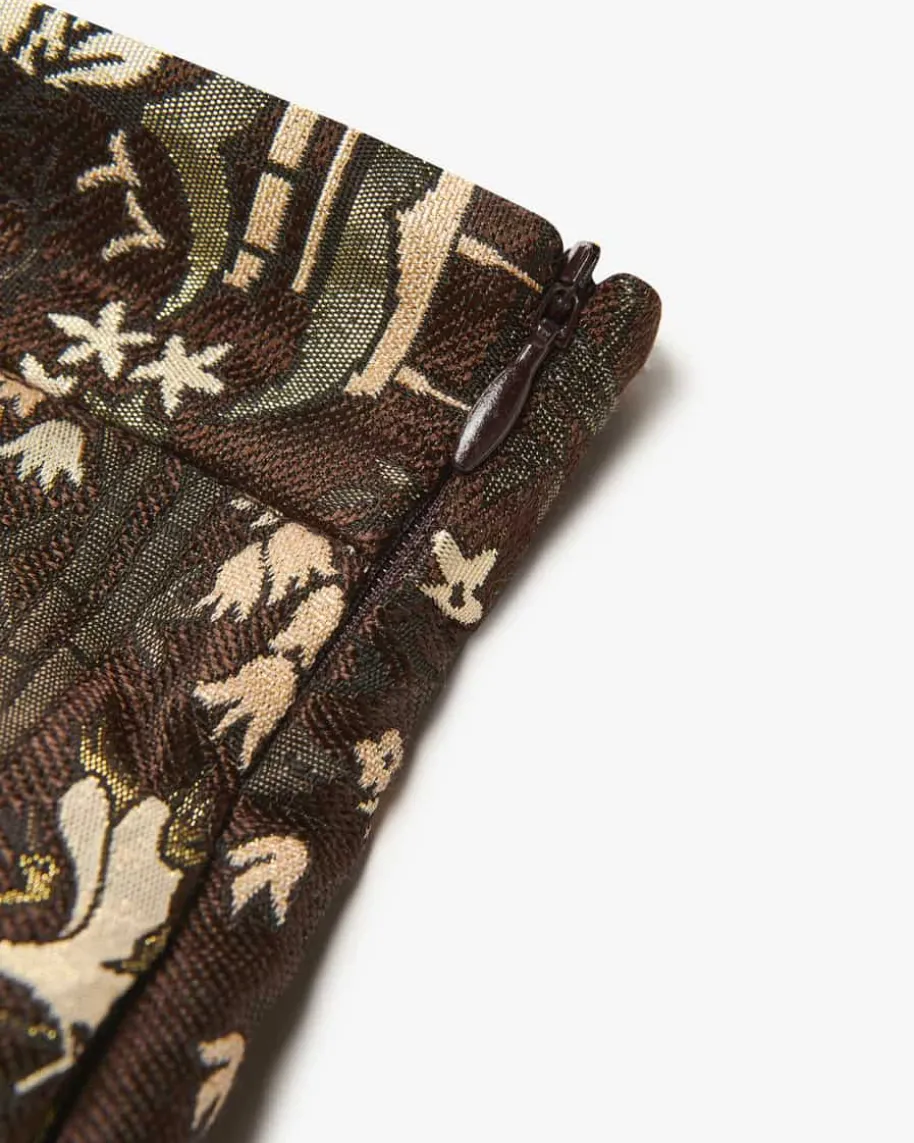 Luna Asia Rock für Damen von Lunatica Milano in Braun, Gold und Creme. LunaticaMilanosteht für handgefertigte Röcke made in Italy – extravagant, farbenfroh undvoller La-Dolce-Vita-Charme. Mit extravagantem Asia-Motiv in hochwertigerJacquard-Verarbeitung, femininer A-Linie und markanten Kellerfalten wird diesesModell zum echten Hingucker und verleiht jedem Outfit das gewisse Etwas.