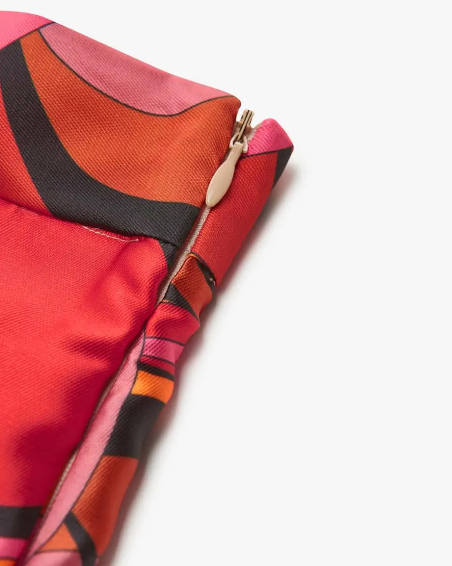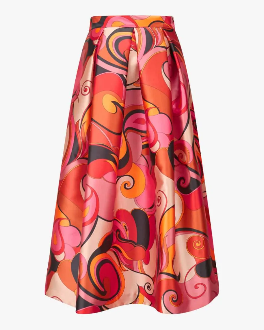 Luna K Groovy Rock für Damen von Lunatica Milano in Orange, Rot und Schwarz. DasModell präsentiert sich mit extravagantem Allover-Print mit abstraktem Pucci-Muster, wobei die A-Linie und die markanten Kellerfalten einen Look schaffen,der aus jedem Outfit einen Hingucker macht.