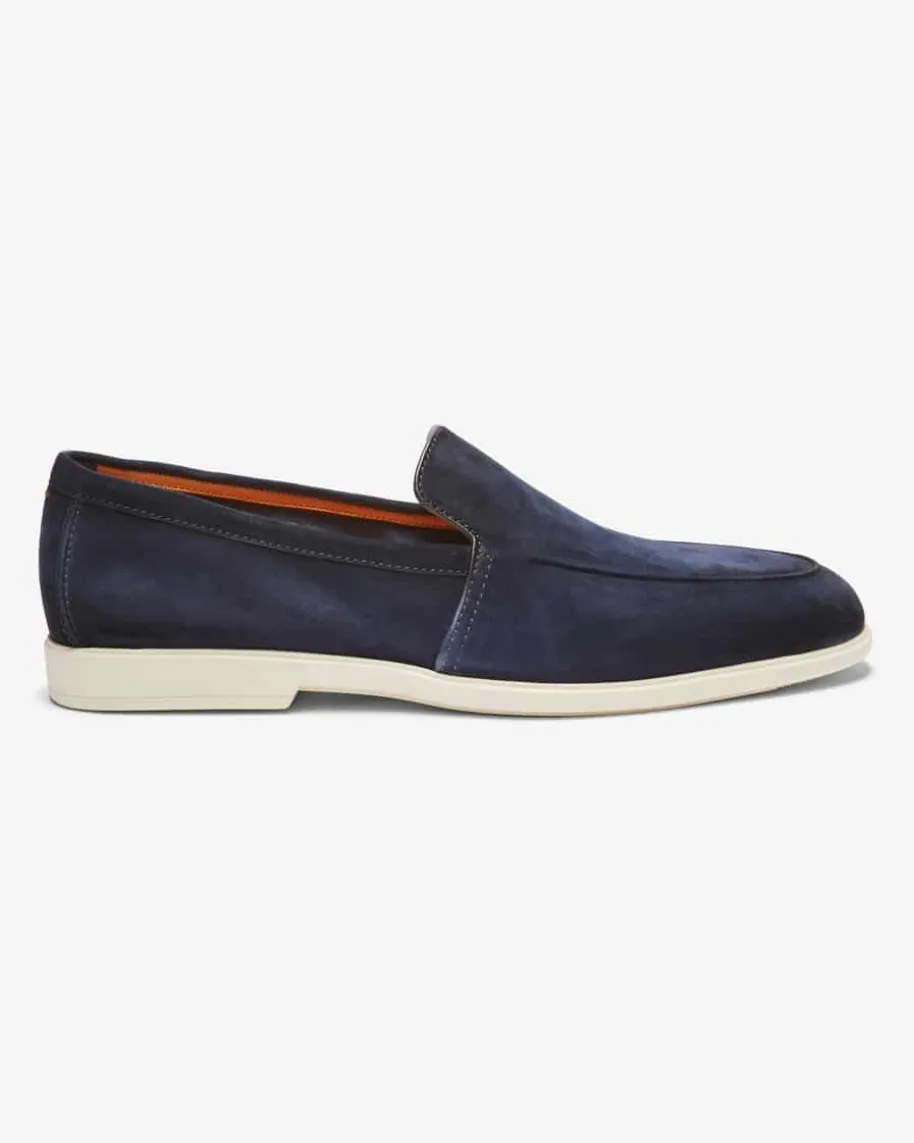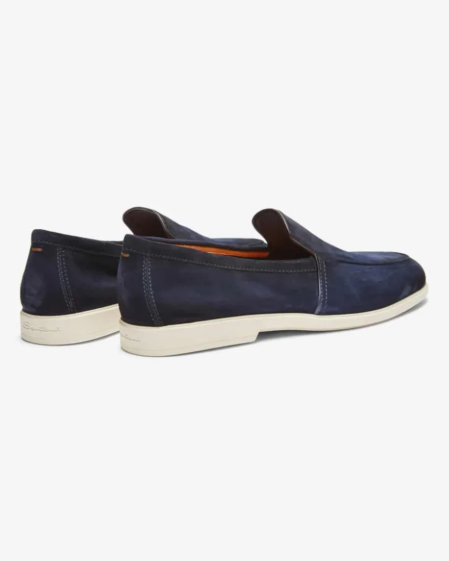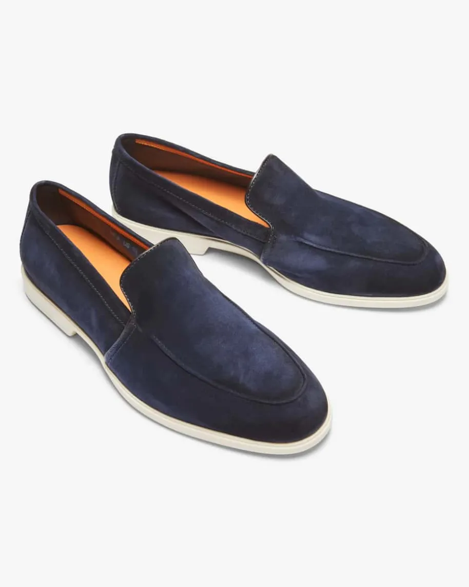 Malibu Loafer für Herren von Santoni in Navy. Das ultraleichte Modell begeistertdank der hochwertigen, soften Veloursleder-Verarbeitung sowie der legerenGummisohle sowohl mit edler Optik als auch mit hohem Tragekomfort, während diefeine Steppnaht den maskulinen Look gekonnt vollendet.