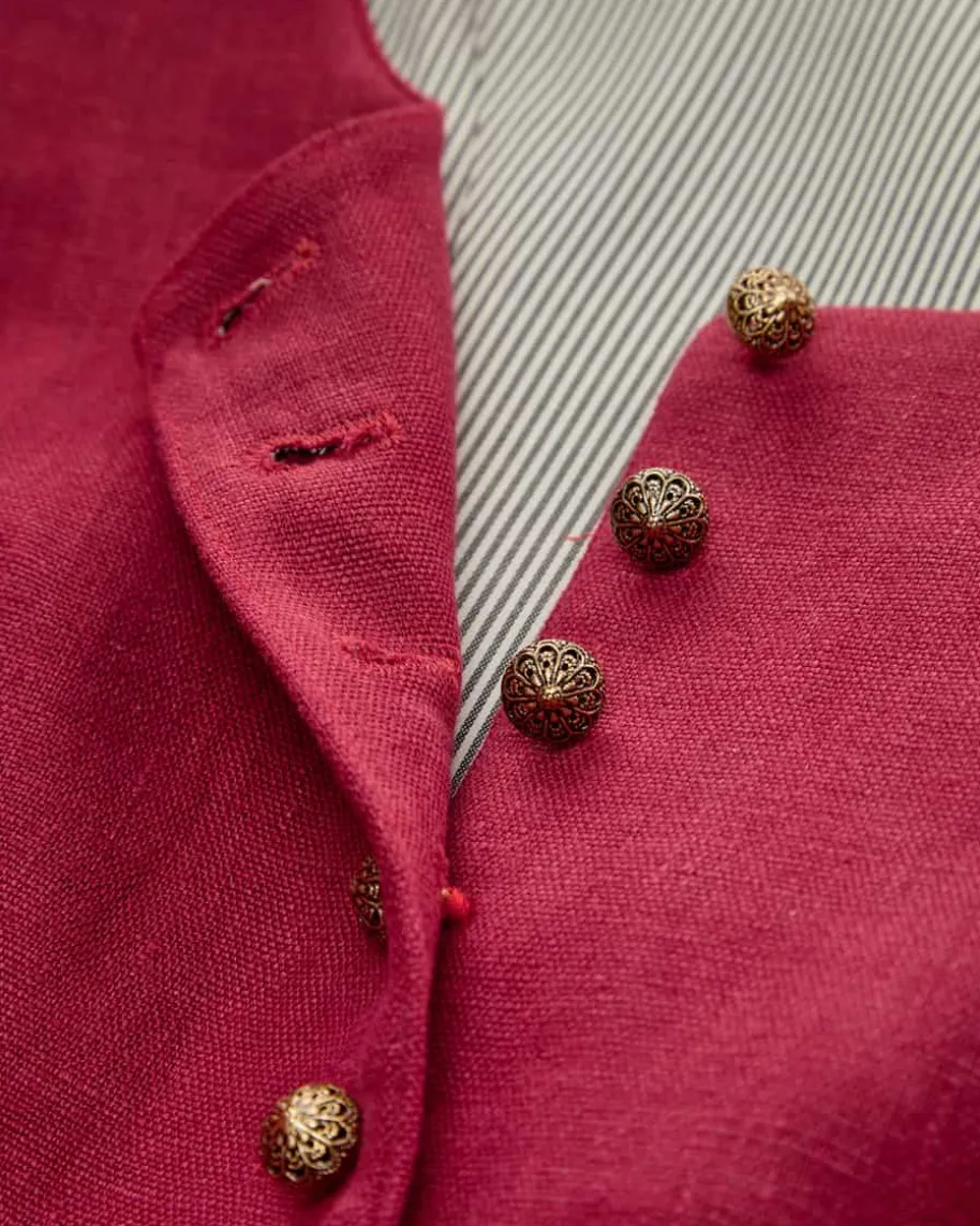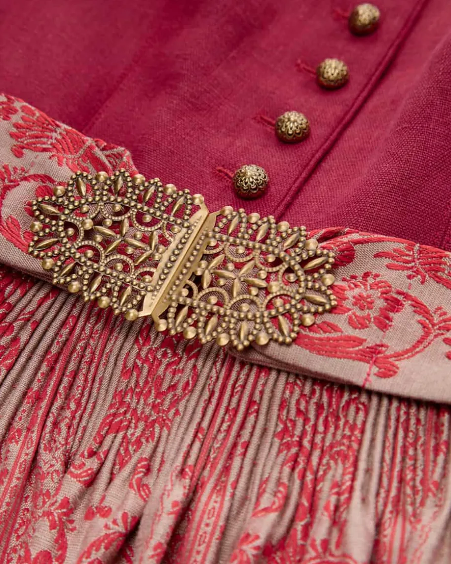 Margret Dirndl lang mit Schürze für Damen von Gottseidank in Dunkelrot, Sand undRot. Tracht mit modernem Zeitgeist – Dank hochwertiger Leinen-Qualitätbegeistert das Modell mit traditioneller Aufmachung sowie romantischer Notedurch die femininen Puffärmel. Zugleich rundet die gestiftelte Schürze mitlabeltypischen, austauschbaren Schürzenbändern und zeitlosem Jacquard-Muster denLook gekonnt ab.