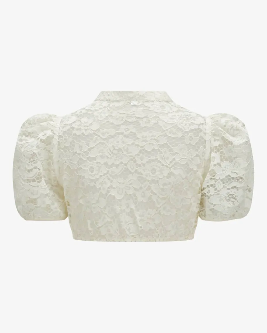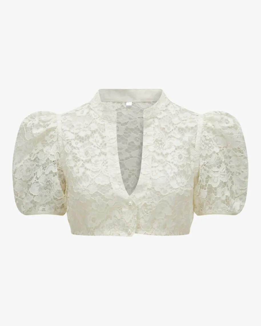 Maria Dirndlbluse für Damen von Giacomelli Trachten in Creme. Dieses Modellbesticht durch die florale Spitzen-Aufmachung, die zusammen mit den Puffärmelnfür einen romantischen Charakter sorgt, während die Knöpfe in Perlmutt-Optik denLook elegant abrunden.