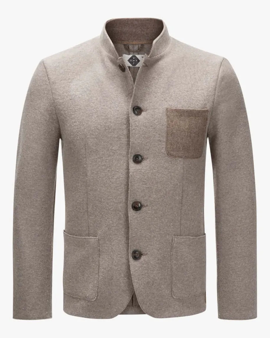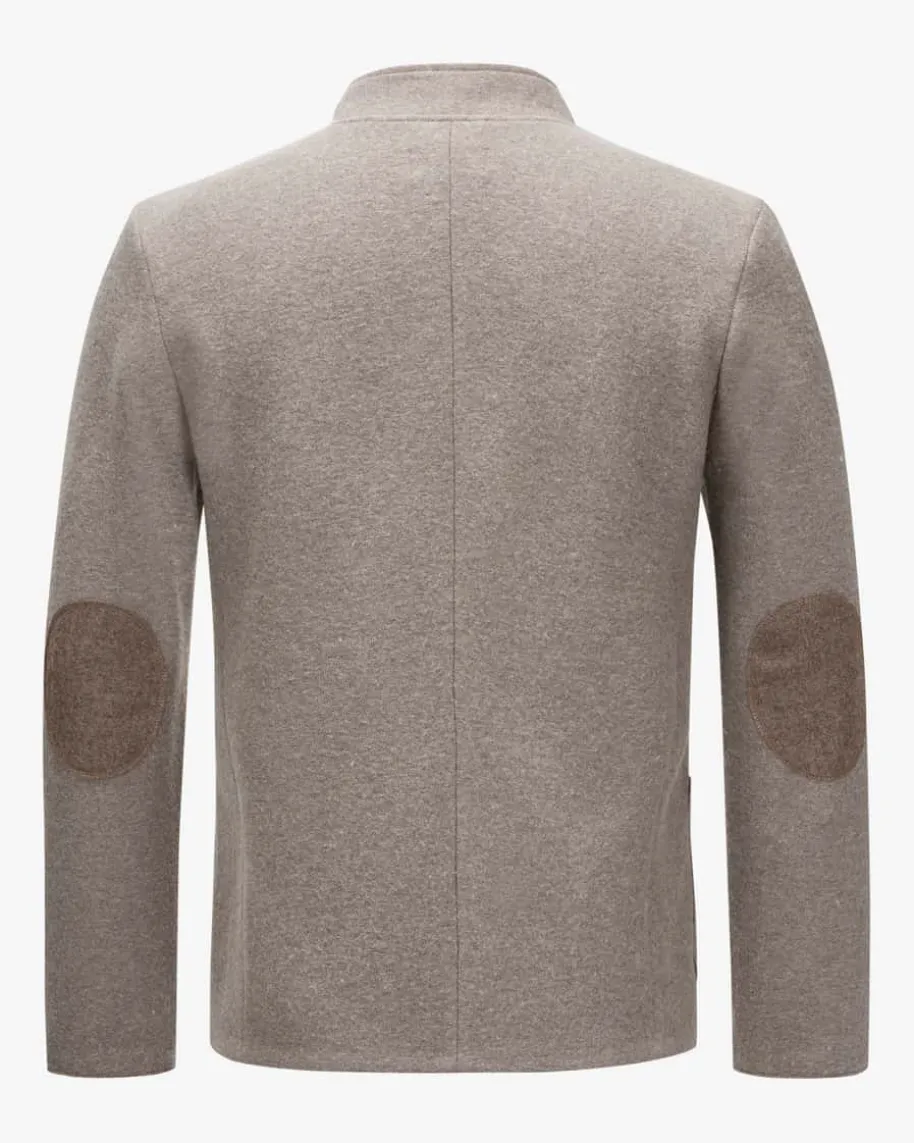 Maximilian Trachten-Janker für Herren von Stapf in Taupe. In schlichter Eleganzpräsentiert sich das gerade geschnittene Modell dank dem hochwertigen Woll-Mix,während die Logo-Applikation und die Ellenbogen-Patches einen edlen Akzentsetzen.