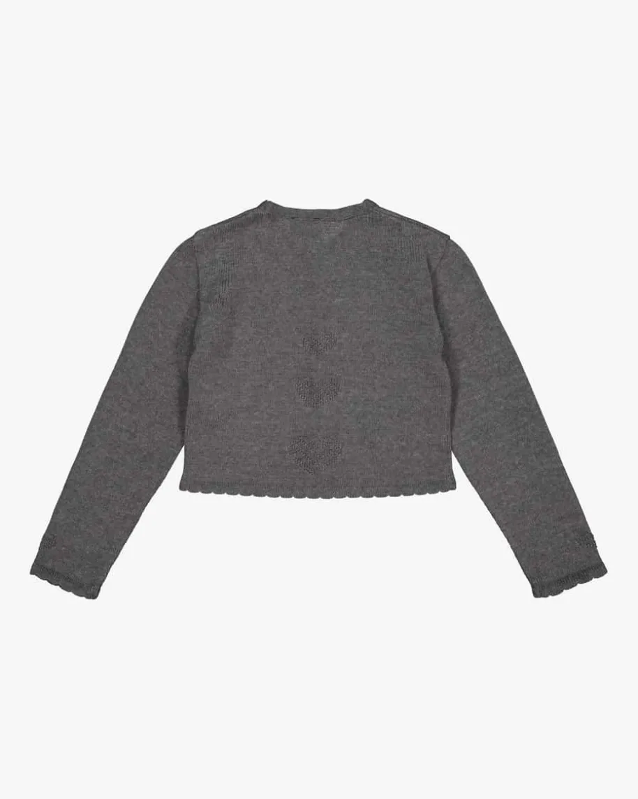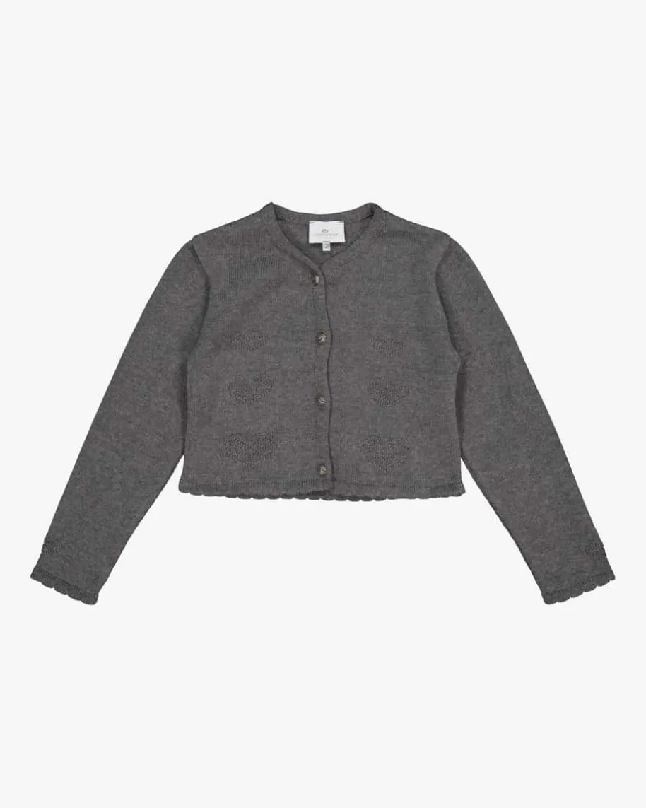 Melanie Strickjacke für Mädchen von LODENFREY in Grau. Das Modell überzeugtdurch die niedlichen Herz-Intarsien, den Wellensaum an den Ärmelenden und dieKugelknöpfe in traditioneller Aufmachung.