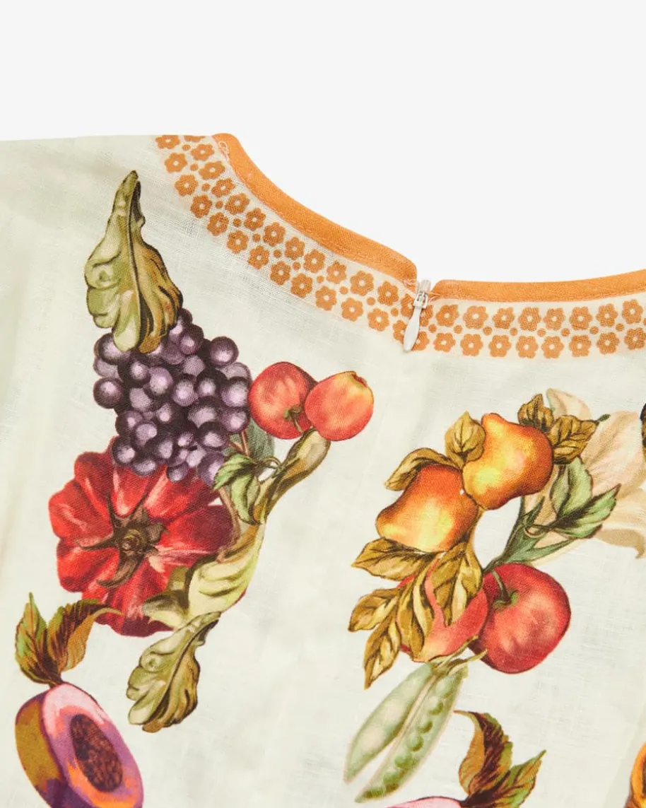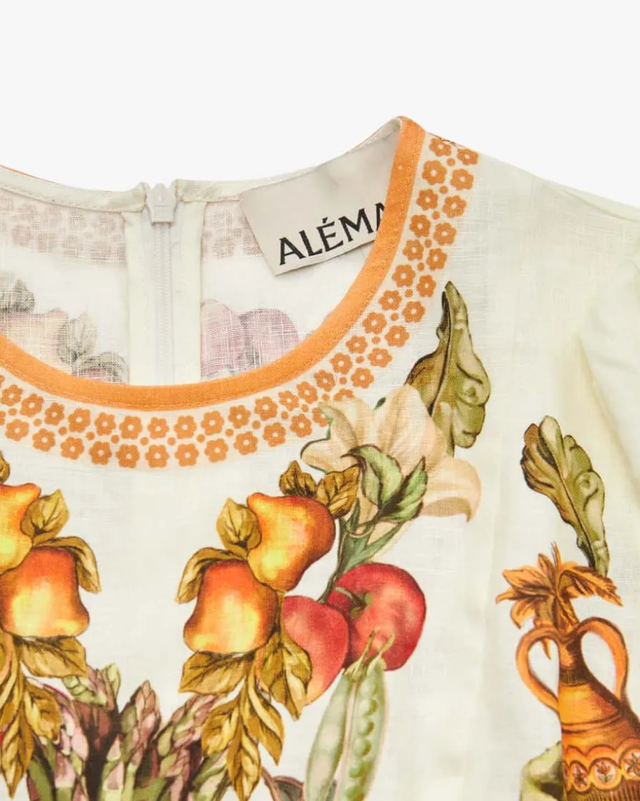Mercado Leinenkleid für Damen von Alémais in Bunt. Das Kreativstudio aus Sydneymit Fokus auf kunstvolle Prints, nachhaltiges Design und nostalgische Ästhetikist unverwechselbar durch Collage-artige Muster, Patchwork-Effekte und Vintage-Flair. Auch dieses Modell punktet mit hochwertiger Leinen-Qualität sowiekreativem Allover-Print mit buntem Obst und Gemüse, während die feminineSilhouette mit Puffärmeln sommerliche Leichtigkeit versprüht.