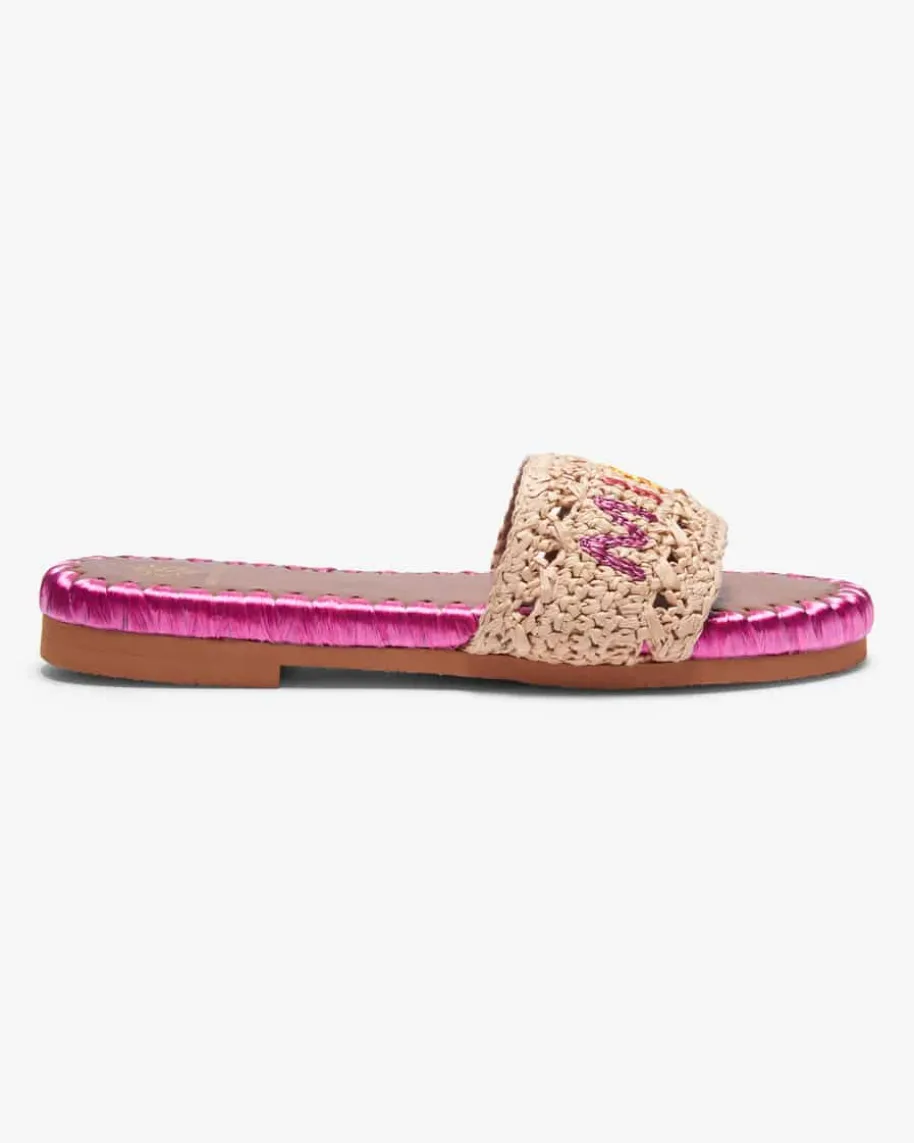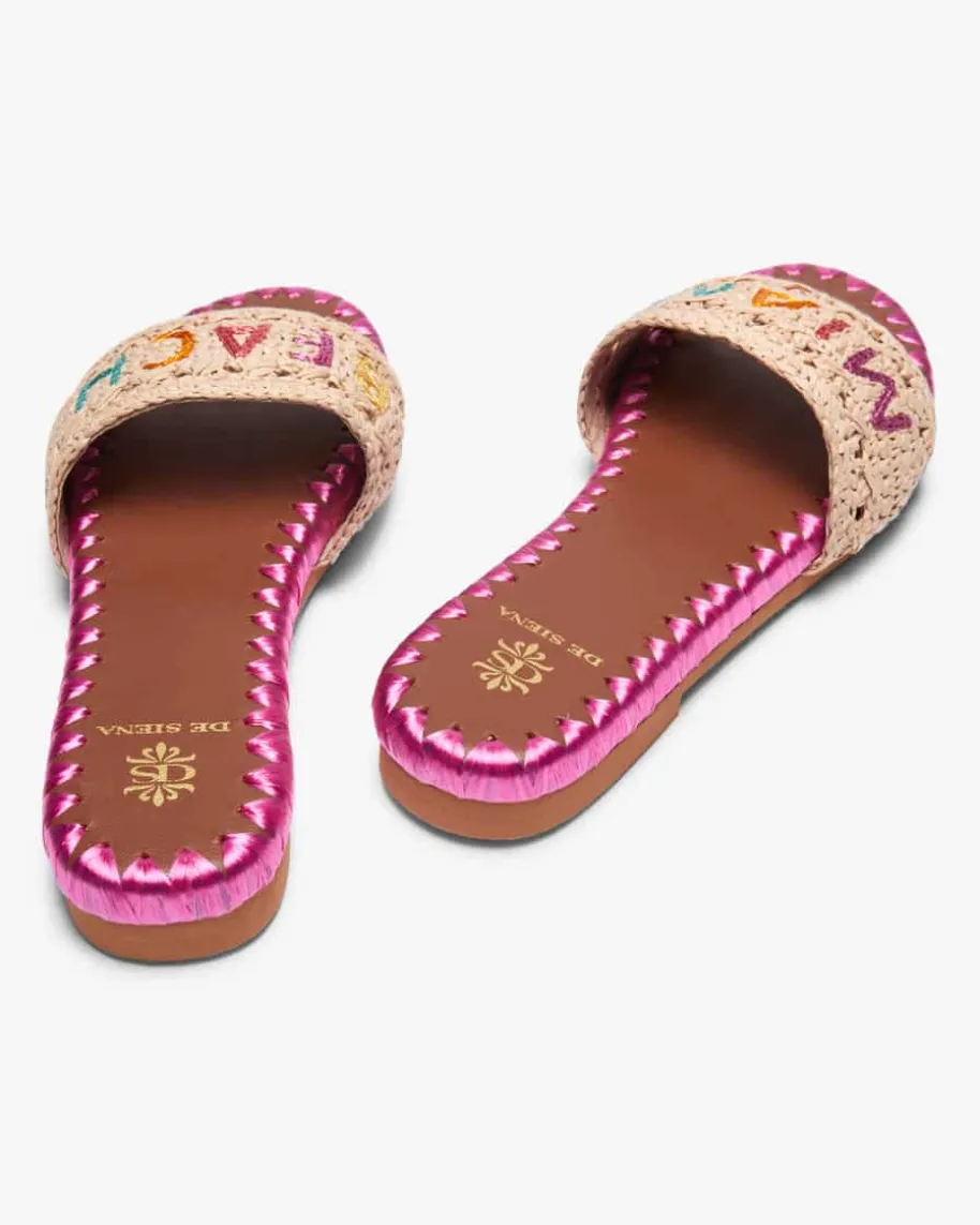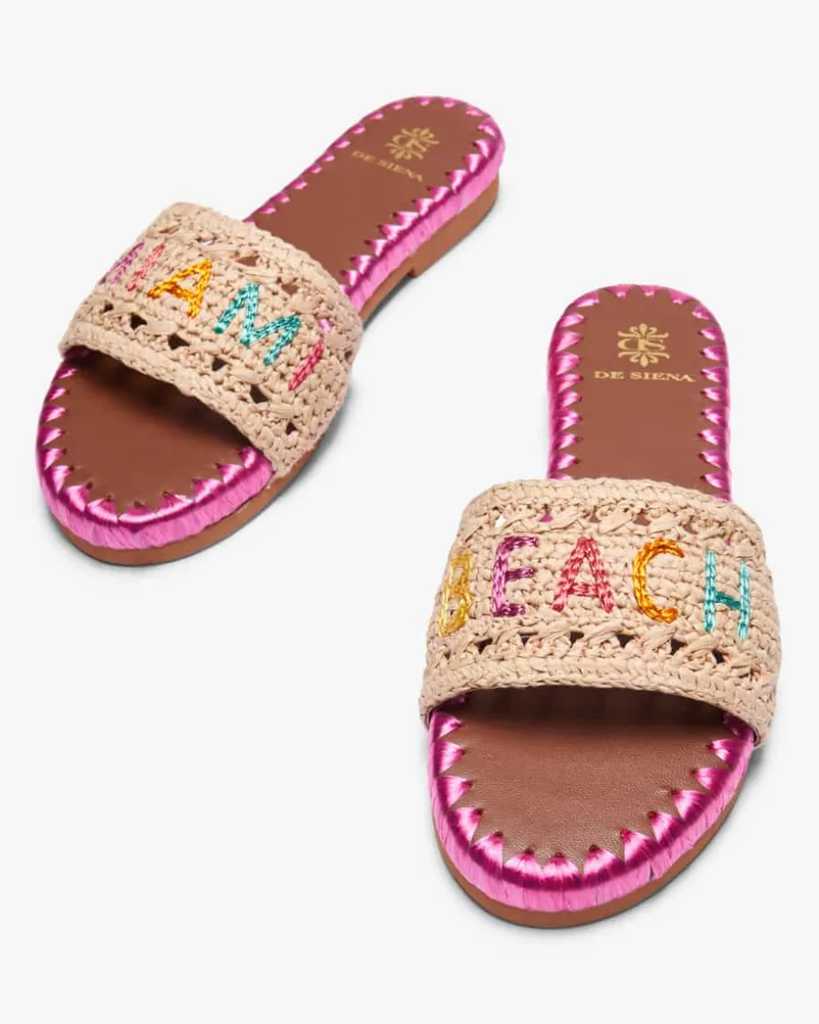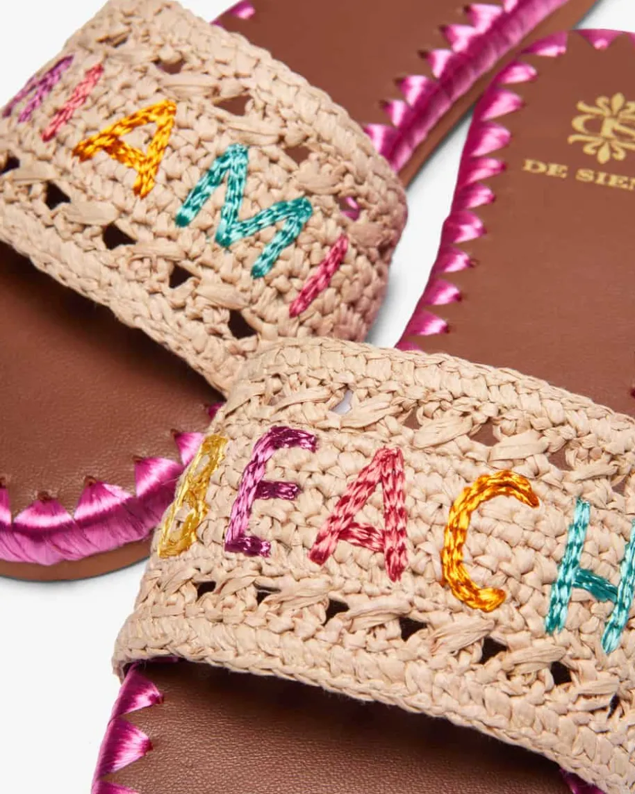 Miami Beach Pantoletten für Damen von De Siena in Natur, Pink und Braun. Dankder modischen Bast-Aufmachung besticht das Modell als sommerlicher Favorit, während der gestickteSchriftzug dem Gesamtbild den letzten Schliff verleiht.