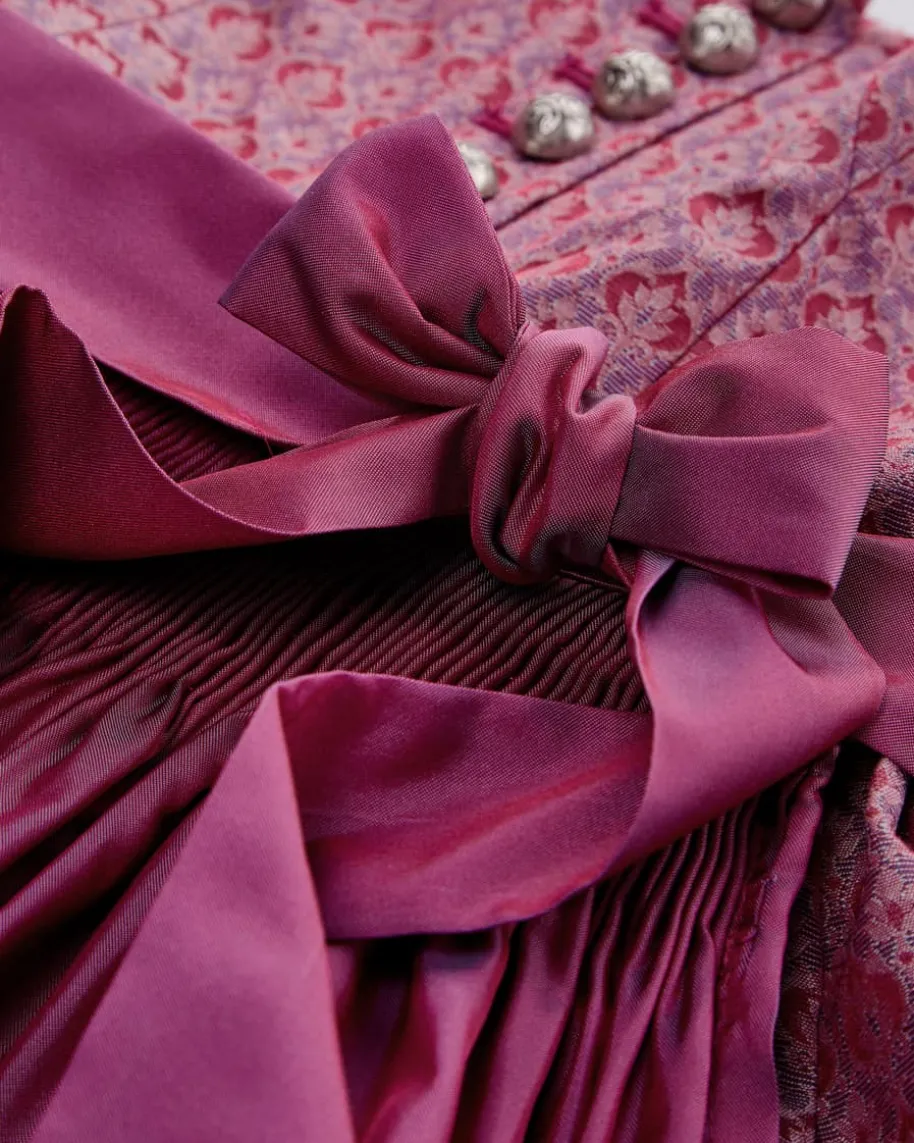 Midi-Dirndl mit Schürze für Damen von LODENFREY München 1842 inMagenta. Das Modell präsentiert sich dank des floralen Allover-Dessins intraditioneller Aufmachung, während die changierende Schürze aus hochwertigerSeide modische Akzente setzt. Klassische Details sowie Brustabnäher runden dasGesamtbild mit femininem Charme ab.