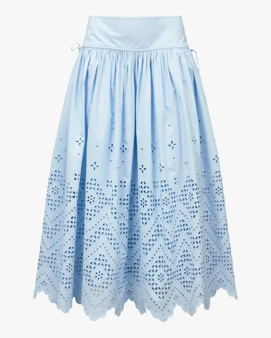 Midirock für Damen von Self-Portrait in Hellblau. Das Modell begeistert mitsemi-transparenter Lochspitze und femininen Details, die für das gewisse Etwassorgen. Der gereihte Rock in Kombination mit der zarten Muschelkante zauberteinen romantischen Look. Das Modell kann mit dem passenden Top getragen werden.