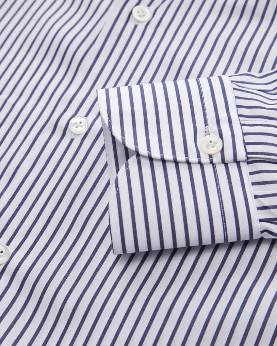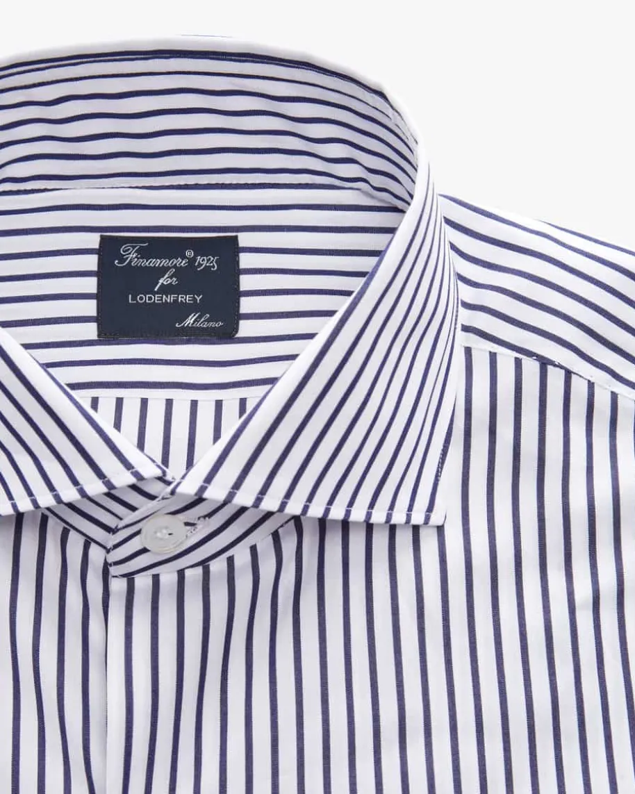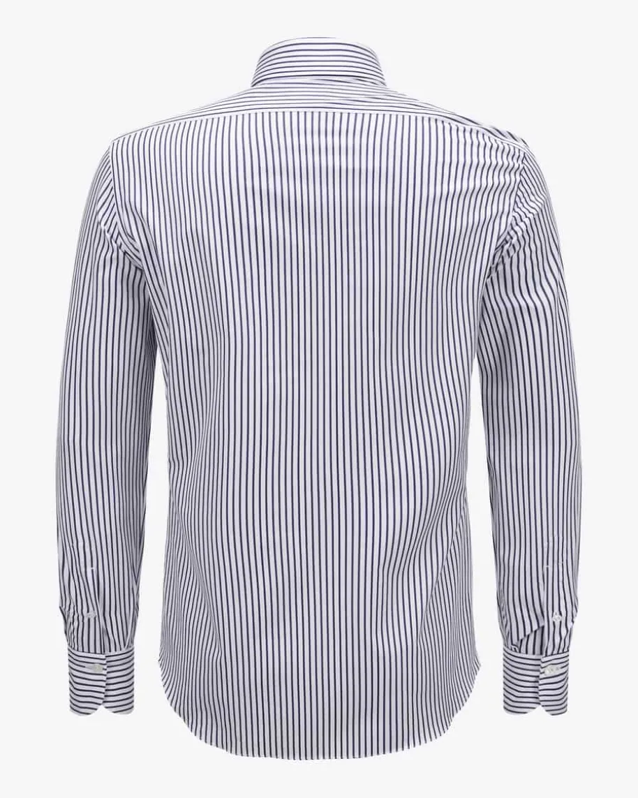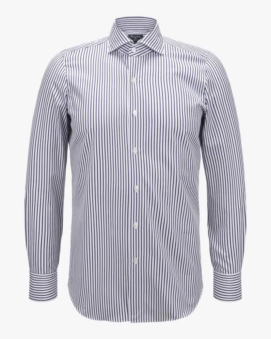 Milano Eduardo Hemd für Herren von Finamore 1925 in Weiß und Navy. Während daszweifarbige Streifenmuster einen modernen Alltags-Look kreiert, sorgt diebesonders leichte Baumwolle für angenehme Tragemomente.