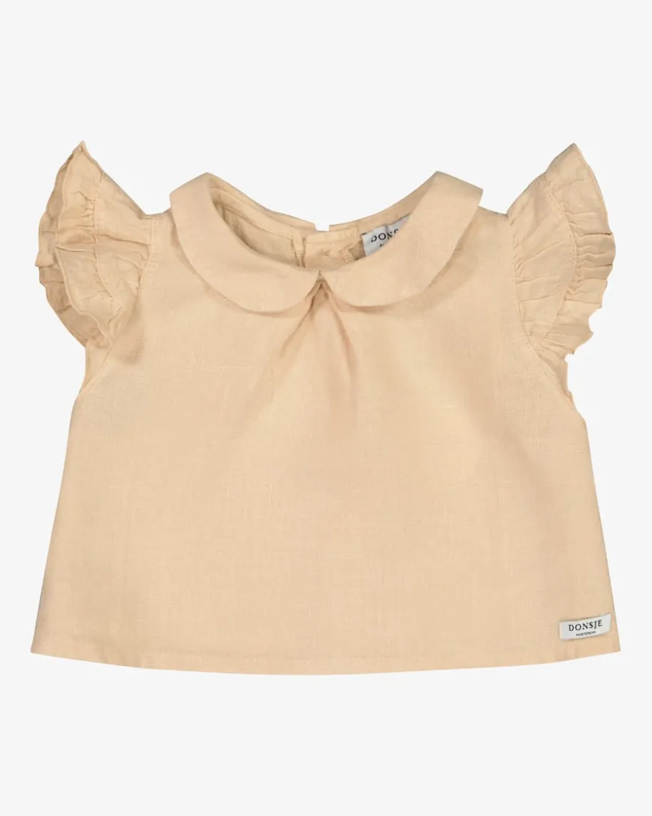 Mimi Baby-Leinen-Bluse von Donsje in Apricot. Die reine Leinen-Qualität verleihtdem Modell eine charmante Optik, während die Volants und der Bubi-Kragen dasModell niedlich vollenden.