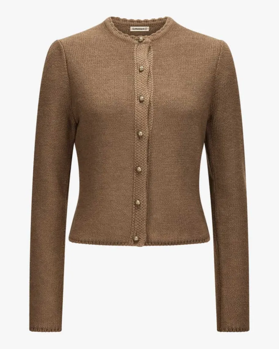Mirl Trachten-Strickjacke für Damen von Gottseidank in Cognac. Die feine Merino-Wolle in Linksstrick-Aufmachung punktet mit besonders angenehmen Tragekomfort,während stilvolle Kugelknöpfe sowie die Raffungen an den Schultern dastraditionelle Modell gekonnt vollenden.