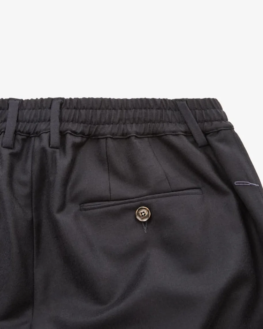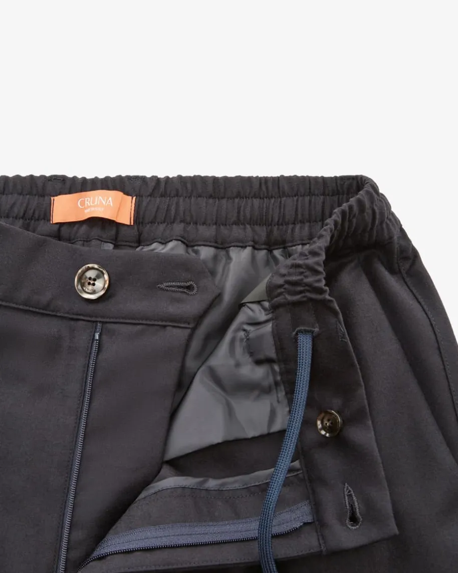 Mitte Wollhose für Herren von Cruna in Schwarz. Das verkürzte Modell bestichtdurch den weichen Woll-Cashmere-Mix mit innenliegendem Tunnelzug als angenehmerBegleiter, welcher durch die Bundfalten und klassische Details einen stilvollenTouch erhält.