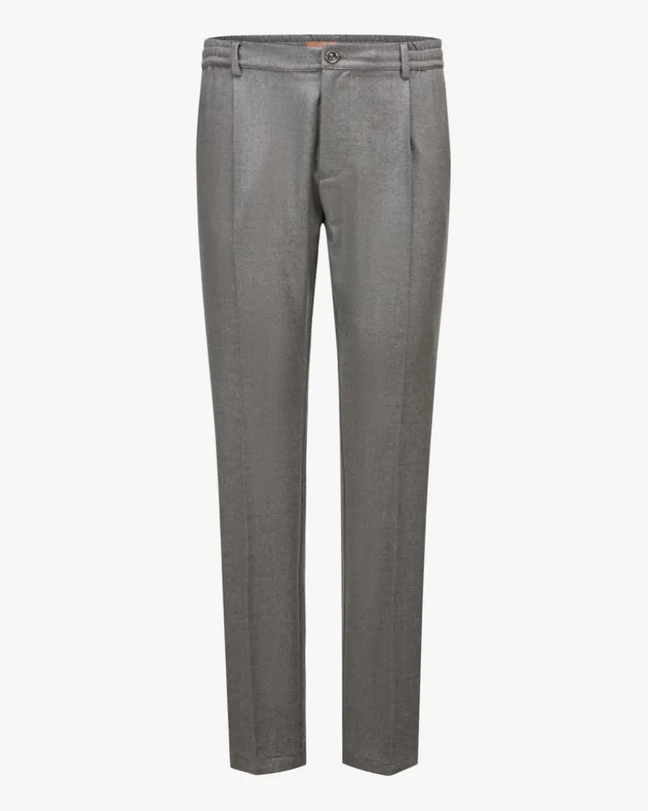 Mitte Wollhose für Herren von Cruna in Grau. Das verkürzte Modell besticht durchden weichen Woll-Cashmere-Mix mit innenliegendem Tunnelzug als angenehmerBegleiter, welcher durch die Bundfalten und klassische Details einen stilvollenTouch erhält.